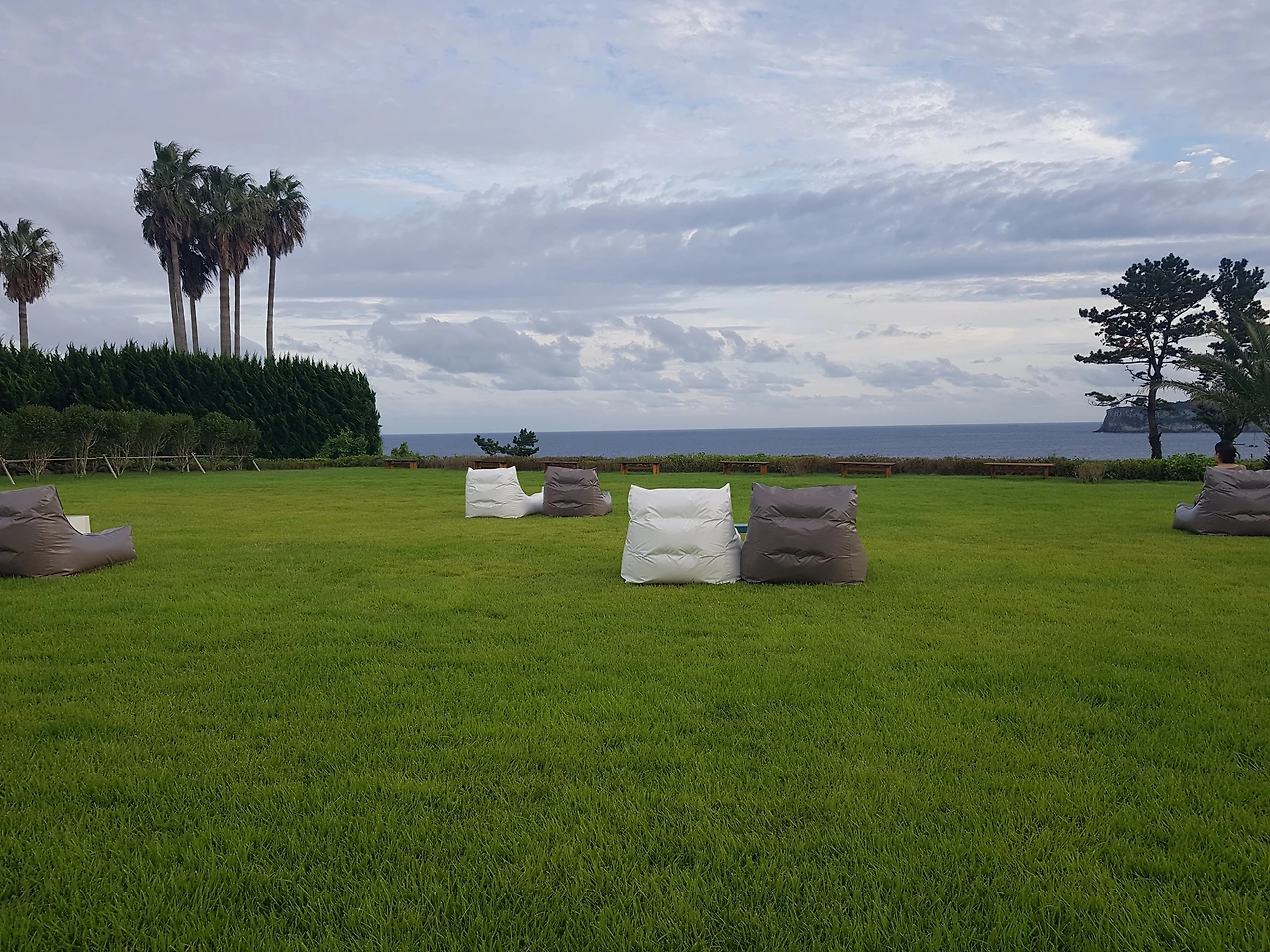 잔디밭에 놓여진 몇 개의 푹신한 의자와 하늘에 드리워진 하얀 천조각들