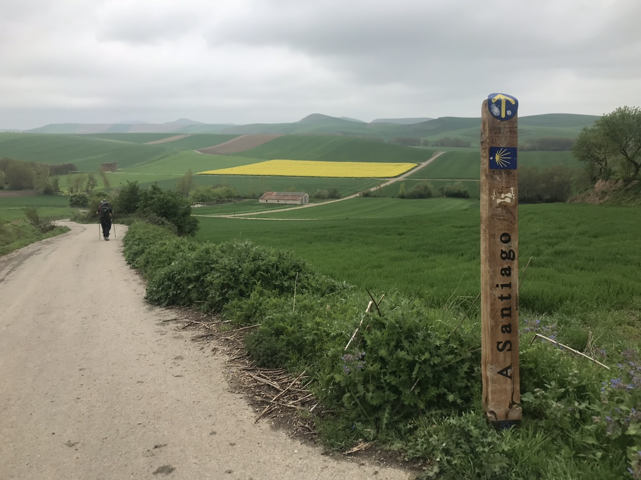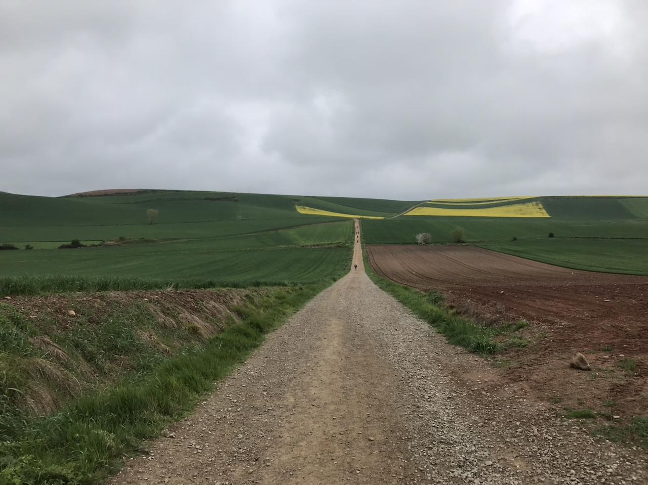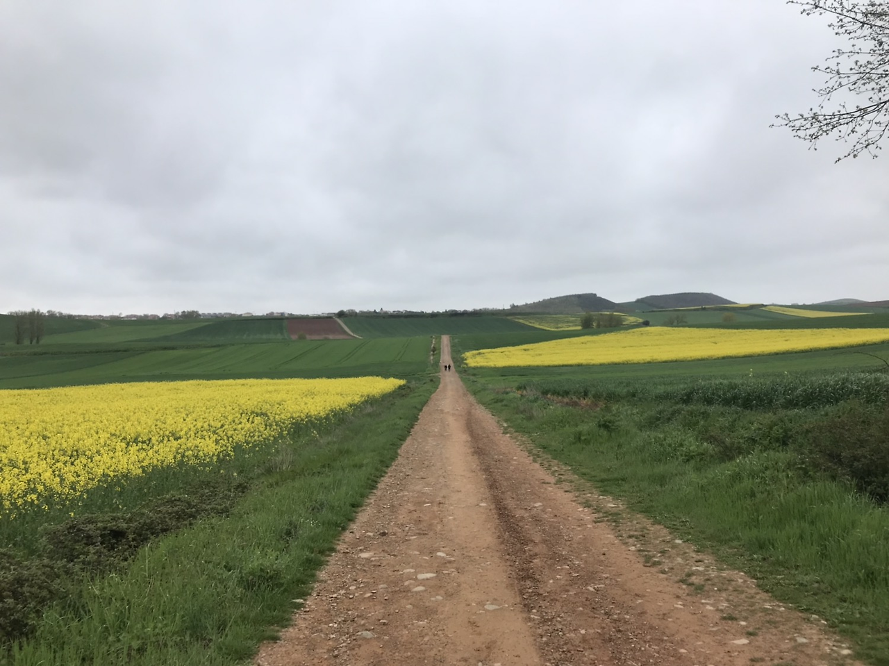 오늘 걸었던 길은 지금까지의 길과는 다른 느낌이었다. 그동안은 중간중간에 언덕도 있고, 길도 있고, 산도 있고 그랬다면 오늘은 유독 직선 길이 많이 나왔다. 또 밀밭과 유채꽃?처럼 보이는 노란 꽃도 있었다. 노란 꽃과 밀밭은 전에도 있었지만 이렇게 직선 길에서 각이 져있는 길은 처음이었다.