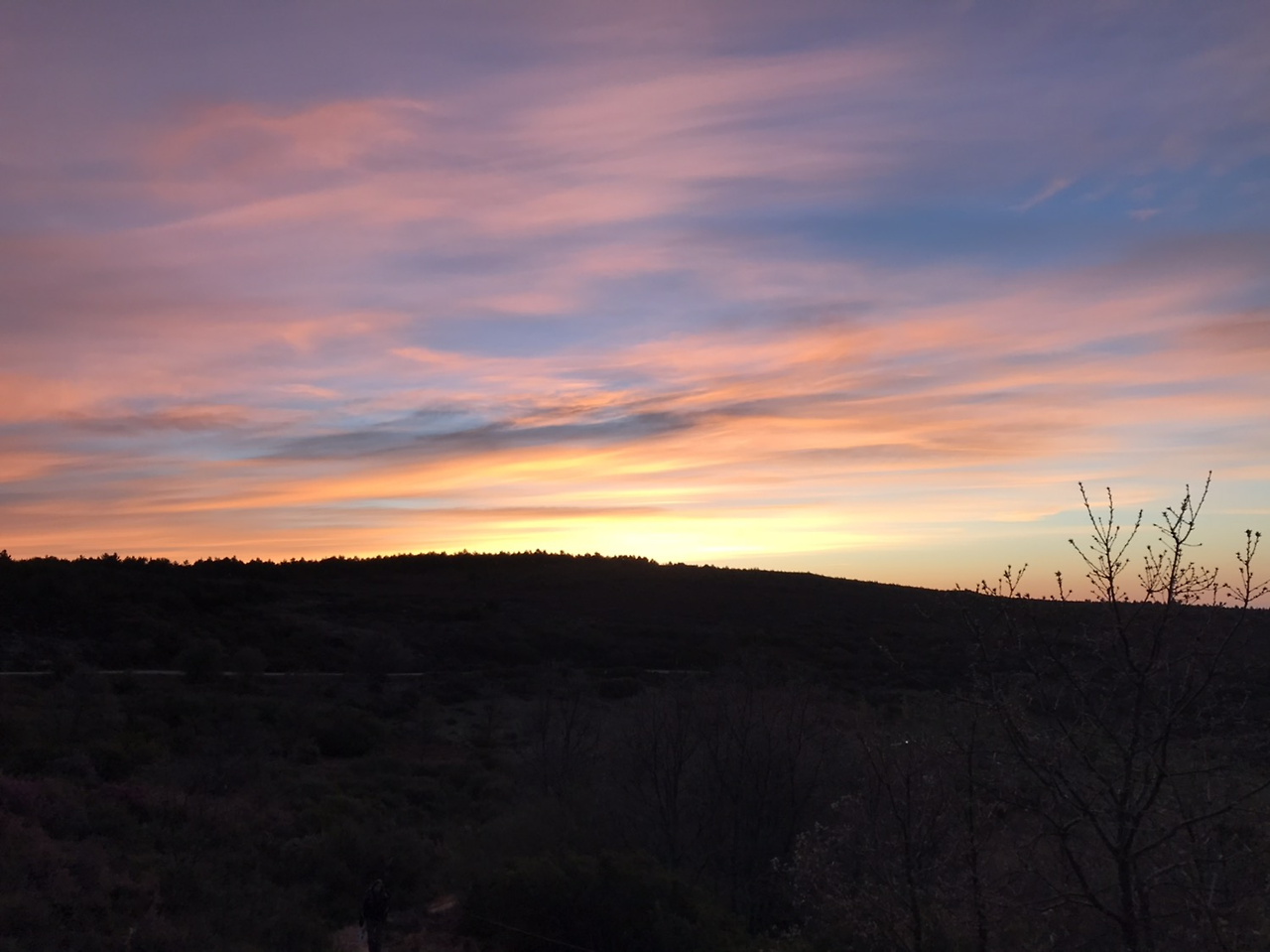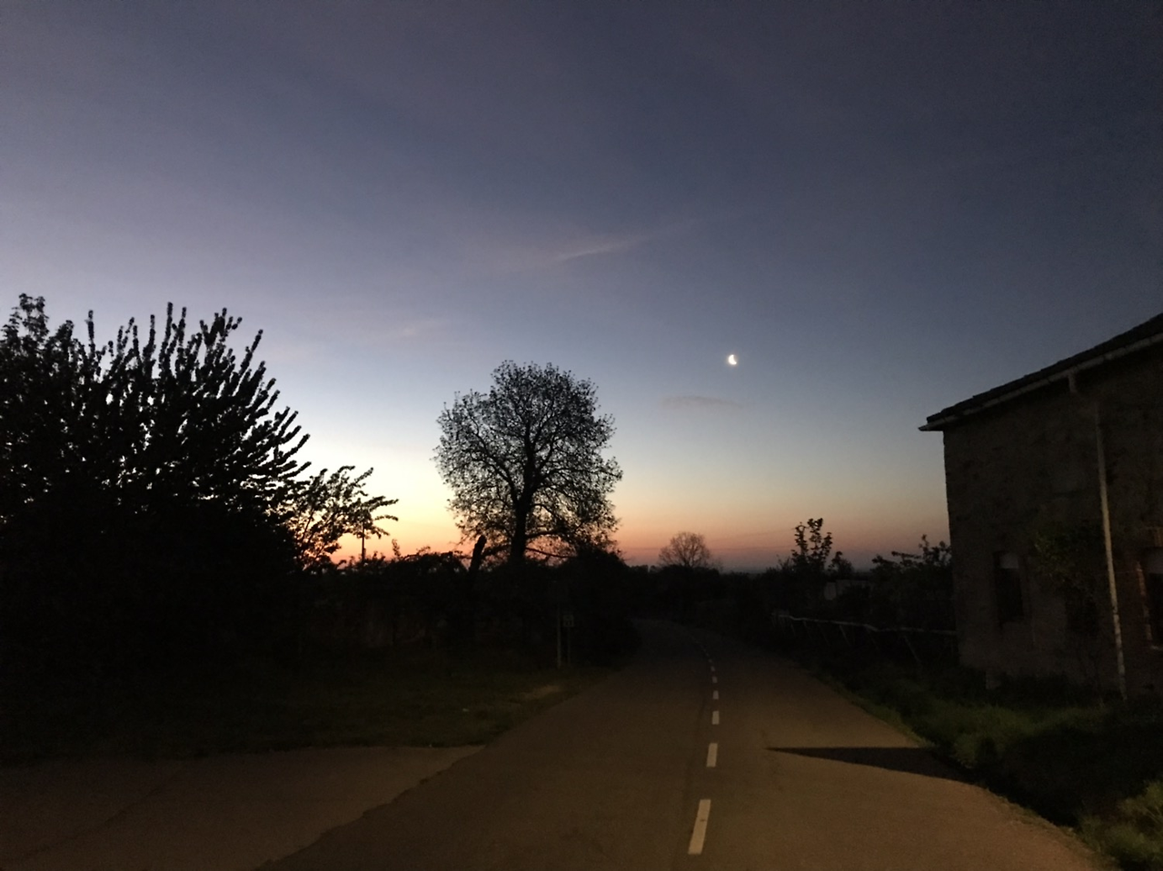 새벽 4시 반에 나와 별을 보고 산 정상에서 일출을 보기로 한 우리의 계획은 알베르게가 6시에 문을 열어주는 바람에 수포로 돌아갔다. 저 멀리 지평선 뒤로 밤하늘과 햇빛이 공존하고 있었다. 해는 우리가 산을 올라갈 때쯤 떴는데 이색적이라고 느낄 만큼 아름다웠다.