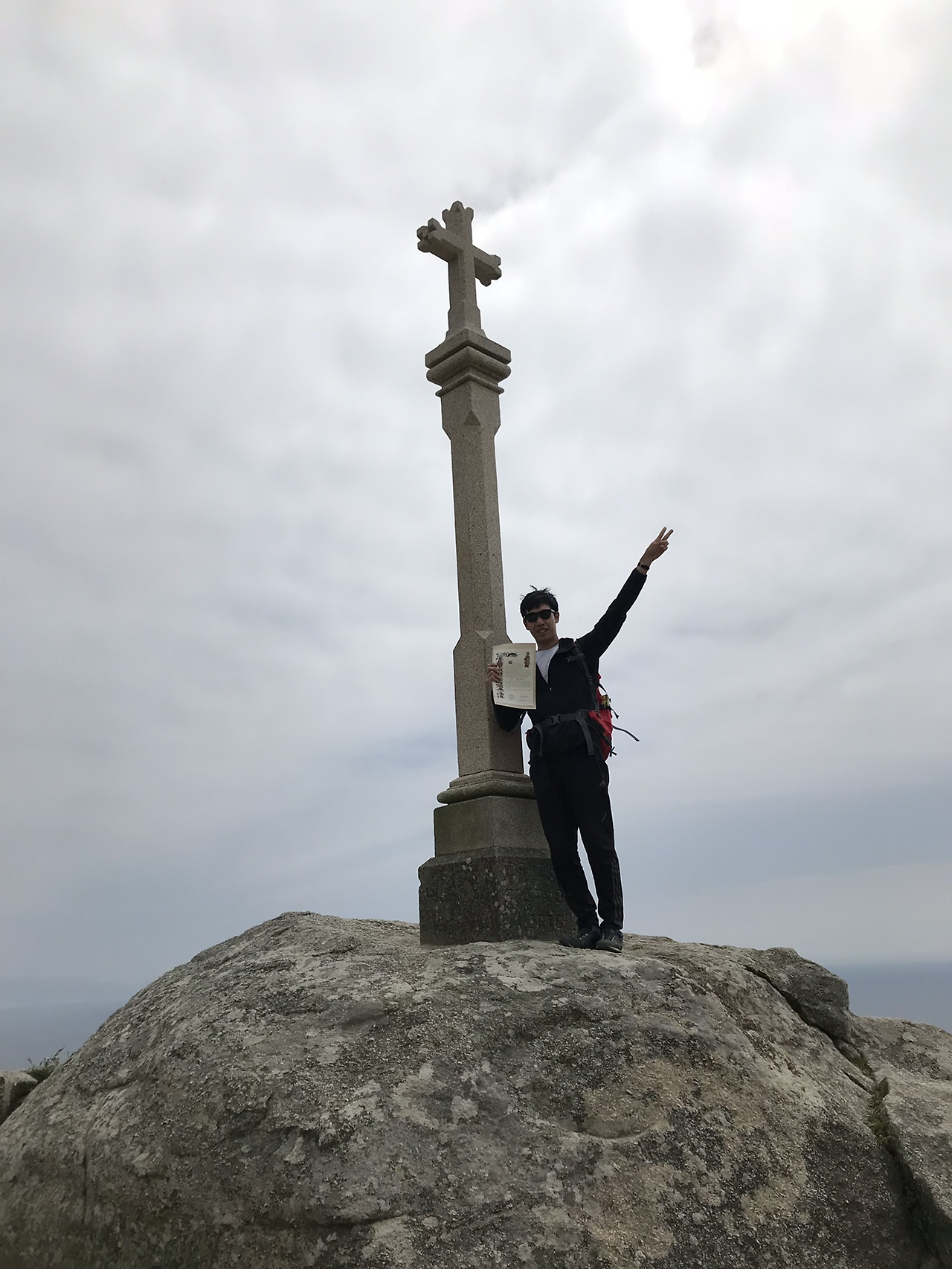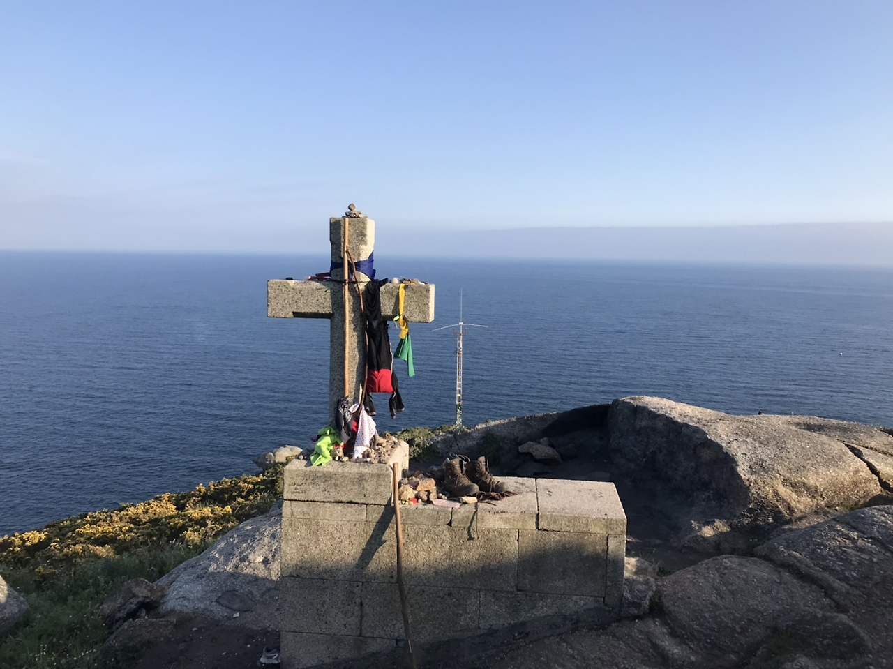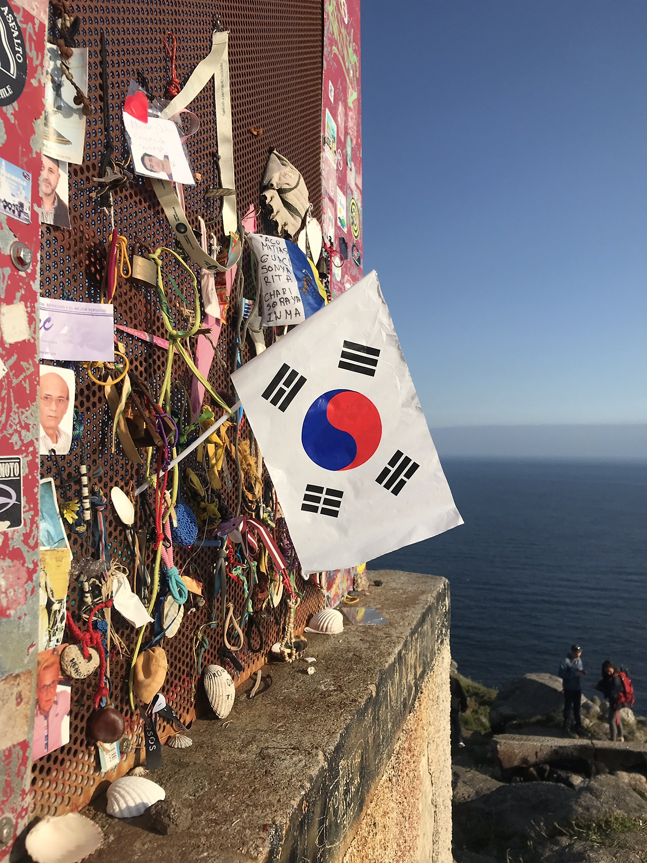 그리고 더 이상 길이 없는 언덕 위에서 우리는 실컷 사진을 찍었다. 과거 이 장소에서는 순례자들이 자기가 신고 온 신발, 가방 등등을 태웠었다고 했는데 지금은 환경 문제로 금지되었다 한다. 그래도 수많은 순례자들이 놓고 간 흔적을 찾아볼 수 있었다. 나는 그 장소에 내가 30일 동안 갖도 다닌 태극기를 꽂고 왔다.