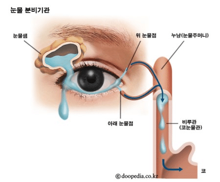 눈물샘은 눈물을 만들고 분비하는 기관일 뿐, 그걸 막힘 없이 코를 통해 배출해내는 건 눈물길(비루관)의 몫이란 거다. 그래서 우리 둘째와 같은 증상에 대해 얘기할 때 '눈물길이 뚫리지 않았다, 눈물길을 뚫어야 한다'와 같이 써야 맞다는 얘기.