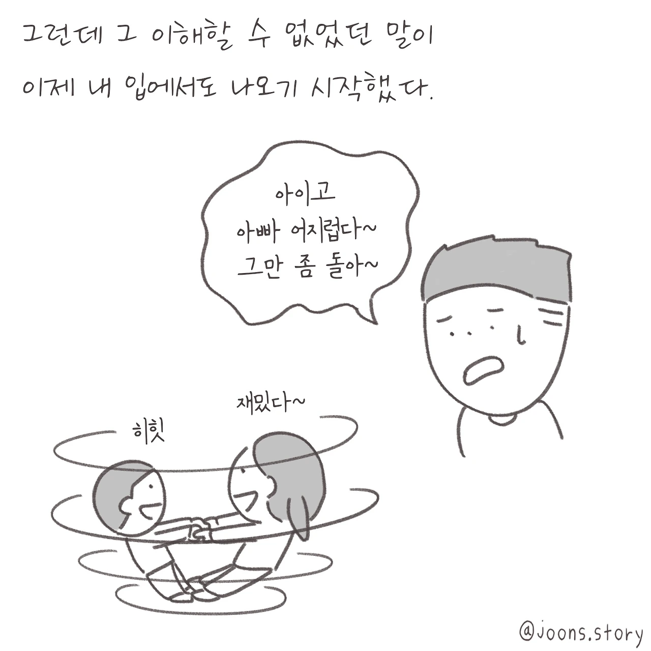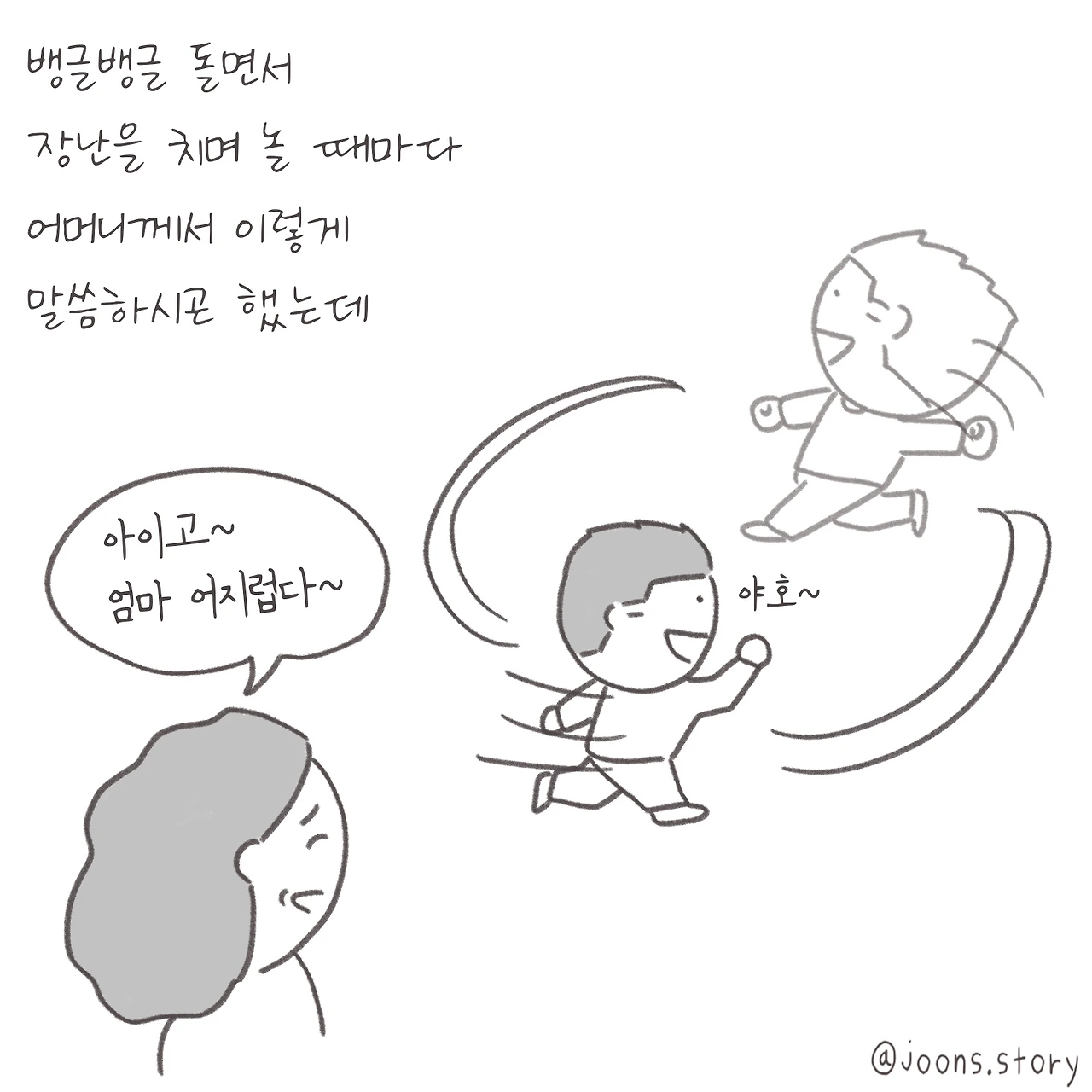 진짜 거짓말인 줄 알았어요. 뱅글뱅글 돌고 있는 나는 하나도 안 어지러운데 보기만 해도 어지럽다고 하는 엄마의 말이.