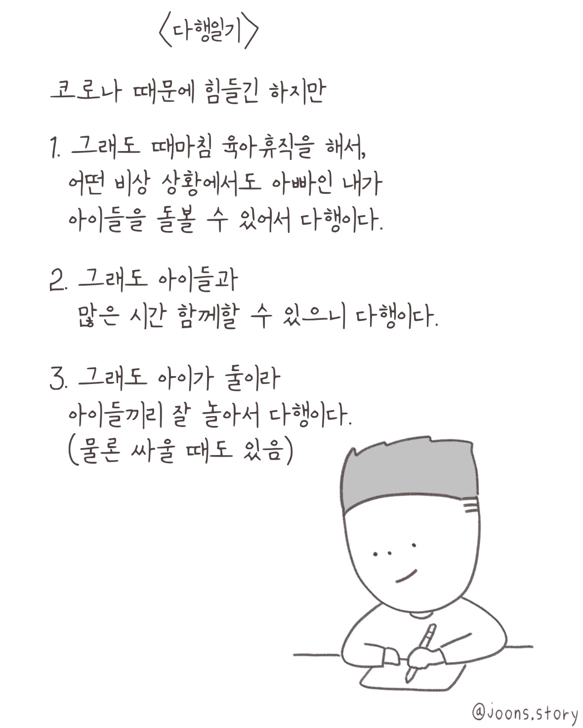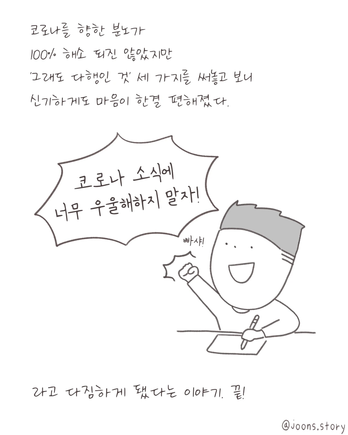 하지만 이제 '다행일기'라는, 좋은 스트레스 해소 방법 하나를 알게 됐으니 코로나 뉴스에 필요 이상으로 분노를 느끼고 표출하는 일은 없을 것 같습니다.