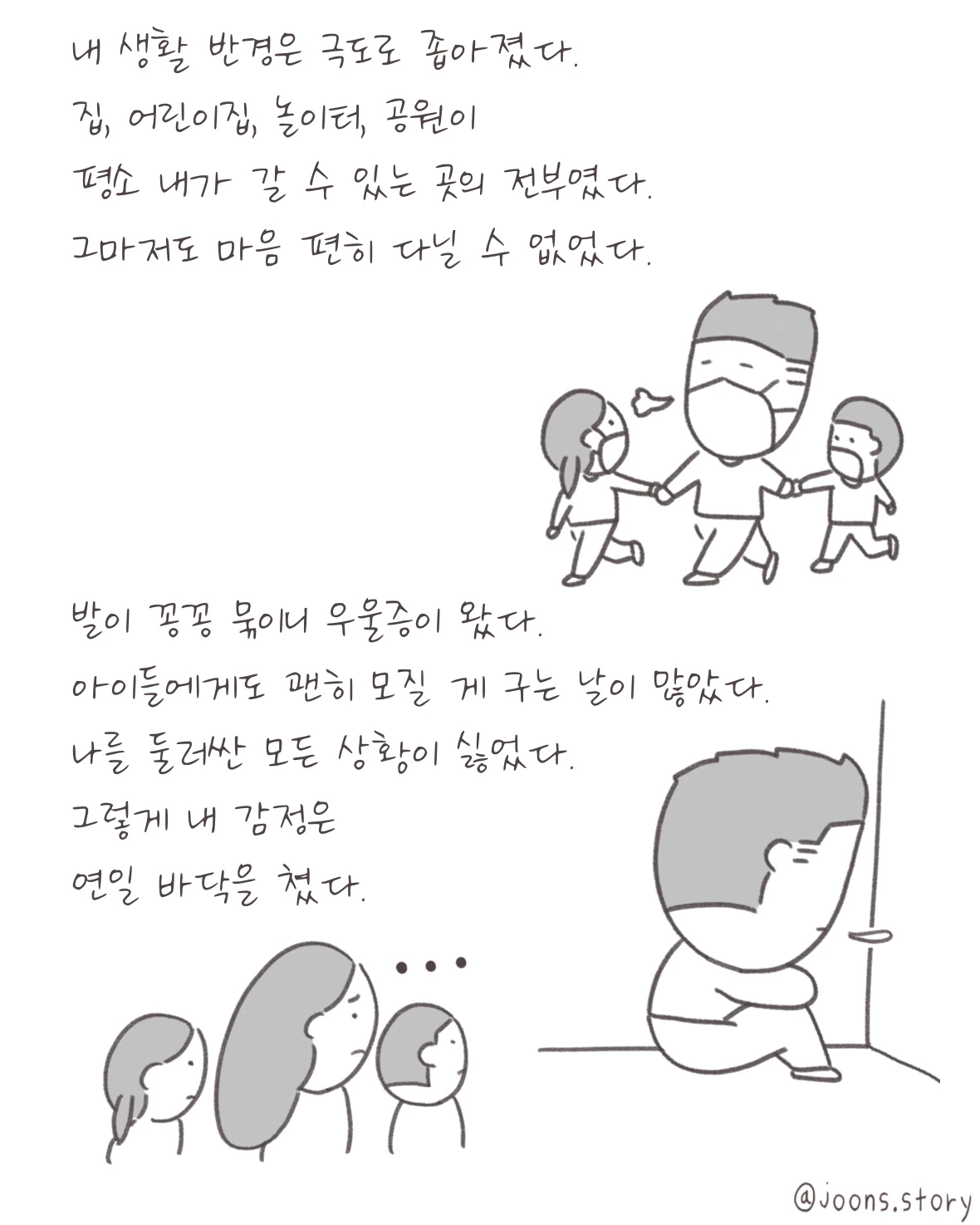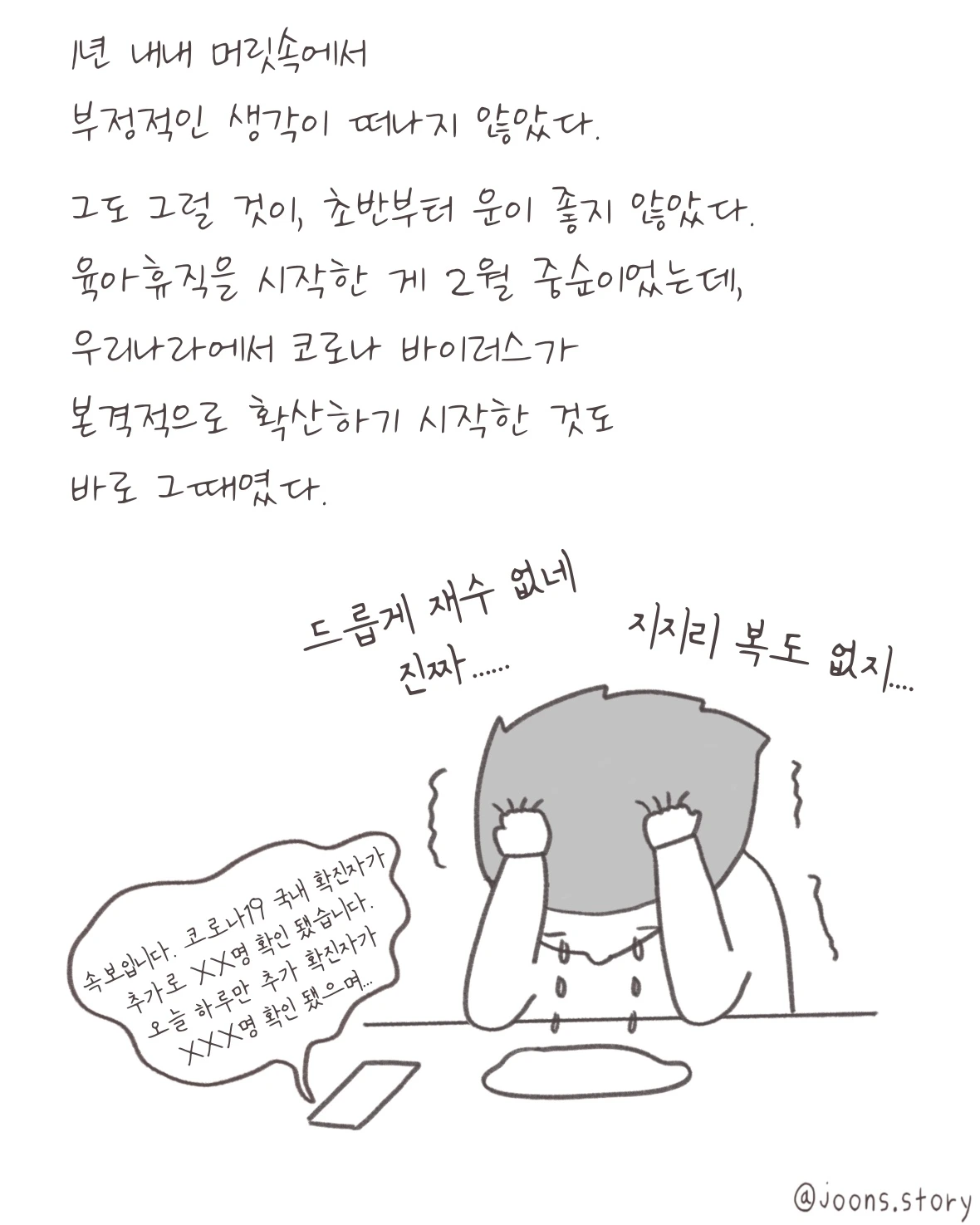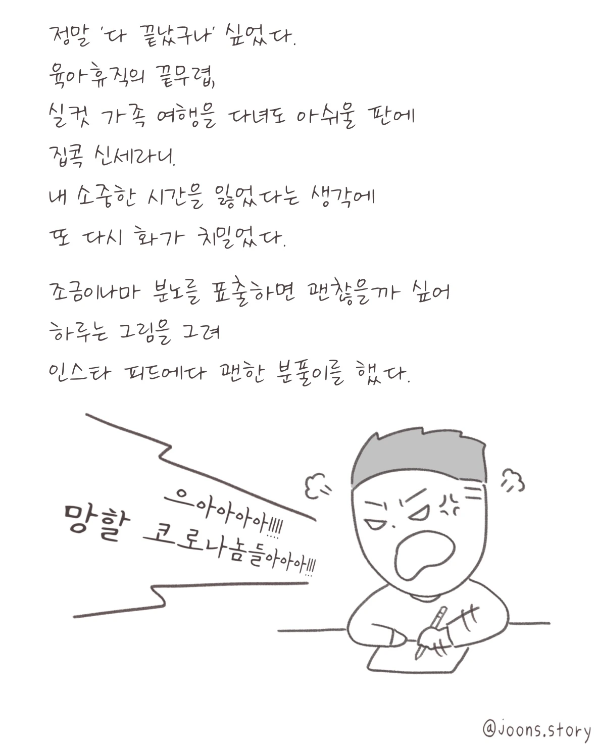 1년 간의 육아휴직이 끝나가는 지금, 최악으로 치닫는 듯한 코로나19 상황은 그동안 꾹꾹 눌러왔던 분노를 터뜨리기에 충분했습니다.