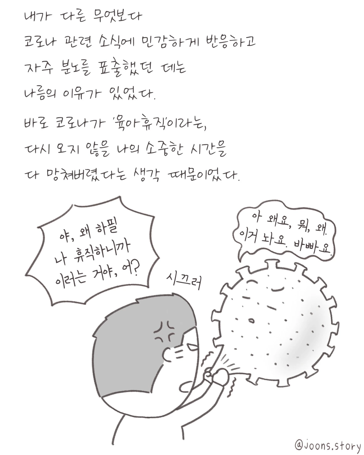 왜 하필 지금이냐. 코로나 네놈이 뭔데 내 육아휴직은 망쳐놓냐. 억울하다는 생각이 들었습니다. 그럴수록 기분은 더 안 좋아졌고 일상생활에도 지장이 생기기 시작했습니다.