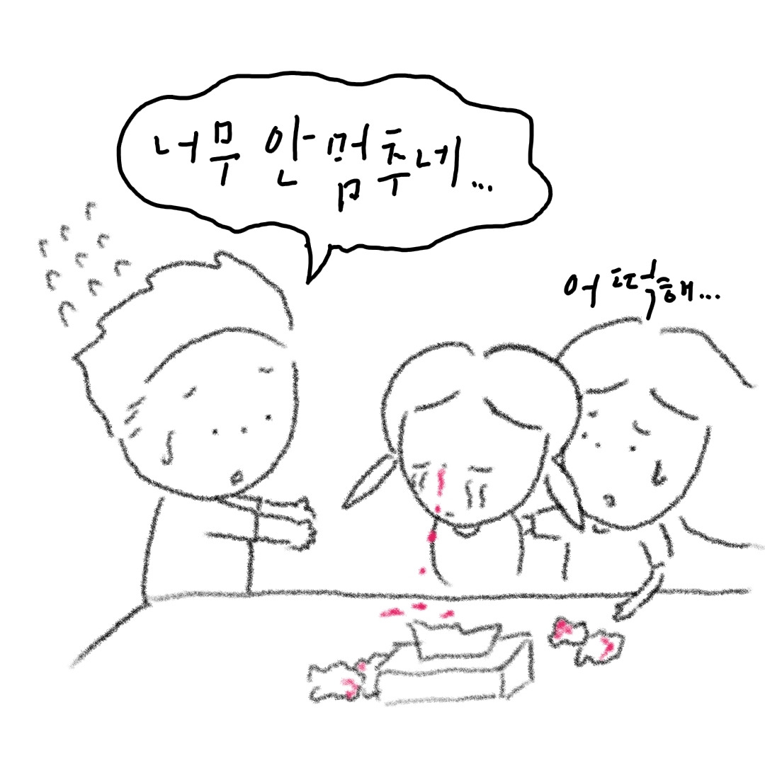콧잔등을 눌러 지혈도 해보았다. 다 소용없었다. 솜 휴지만 빨갛게 물들일 뿐이었다.