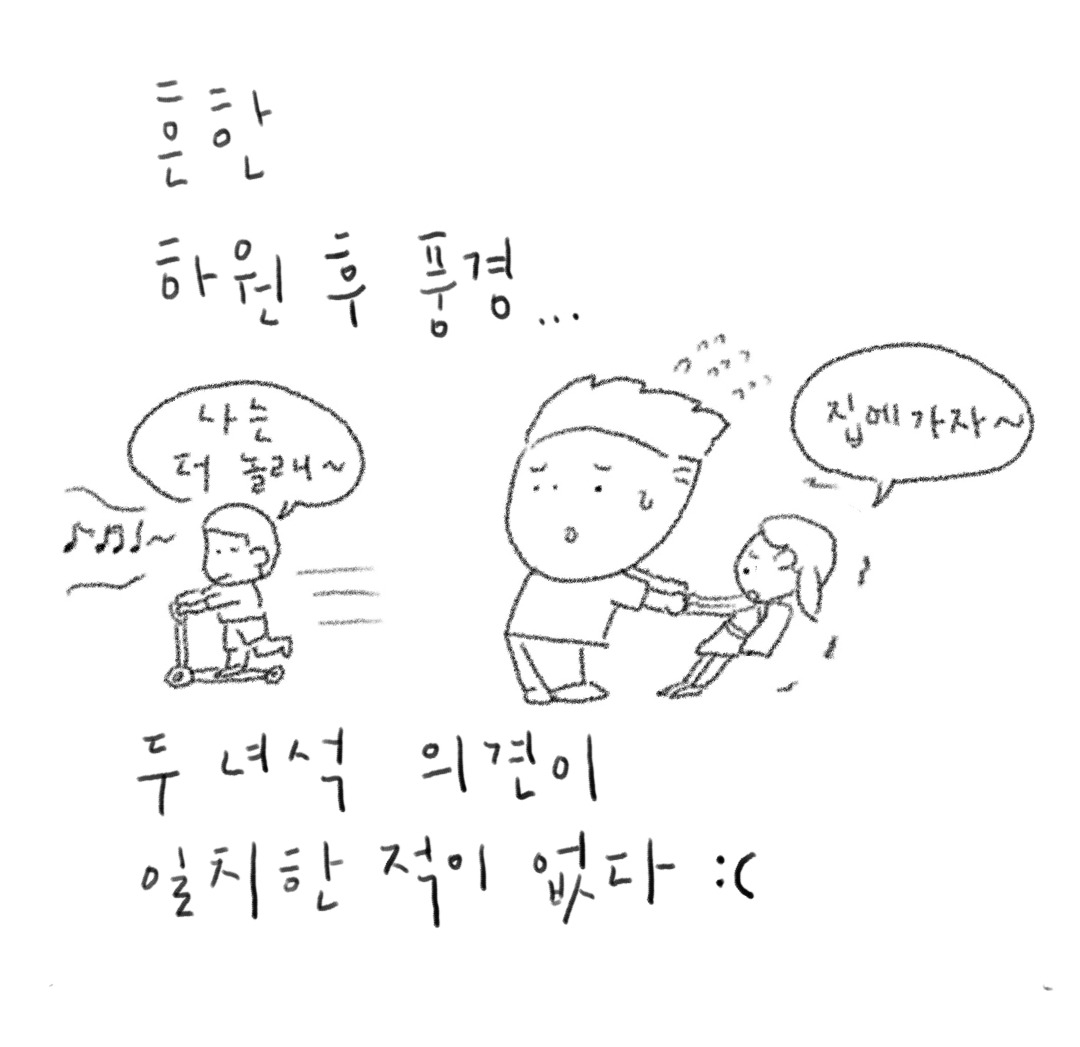 얘들아, 아빠의 몸이 두 개였음 좋겠구나.....생각해보면 둘의 의견이 일치된 적은 별로 없었던 것 같다. 놀이터에서뿐만이 아니라 평소 다른 모든 일에 대해서도.