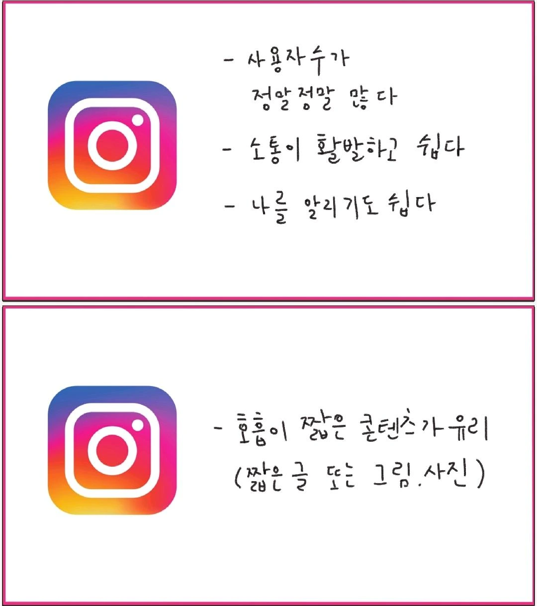 "짧은 글이나 그림으로 사람들과 소통해보고 싶다!" 하시는 분들은 다른 플랫폼보다 인스타그램을 노려보시는 게 유리하실 거예요.