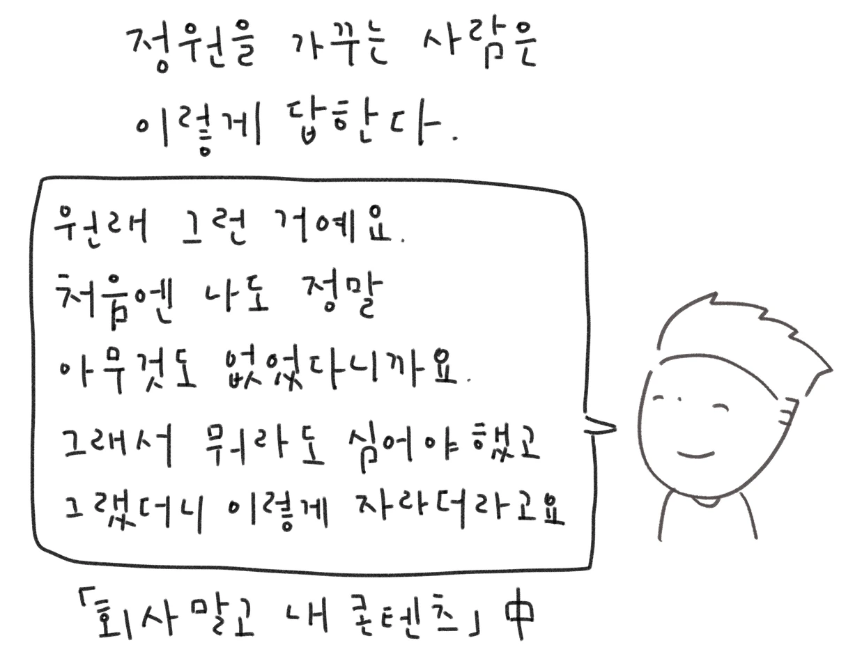 중요한 건 얼마나 큰 부와 명예를 얻었느냐가 아니라, 글을 씀으로써 힘들었던 시간을 이겨내고 스스로 행복을 찾았다는 거였다고 저는 생각해요. 나의 회사 생활이 어떻든 그것과는 상관없이 말이죠.