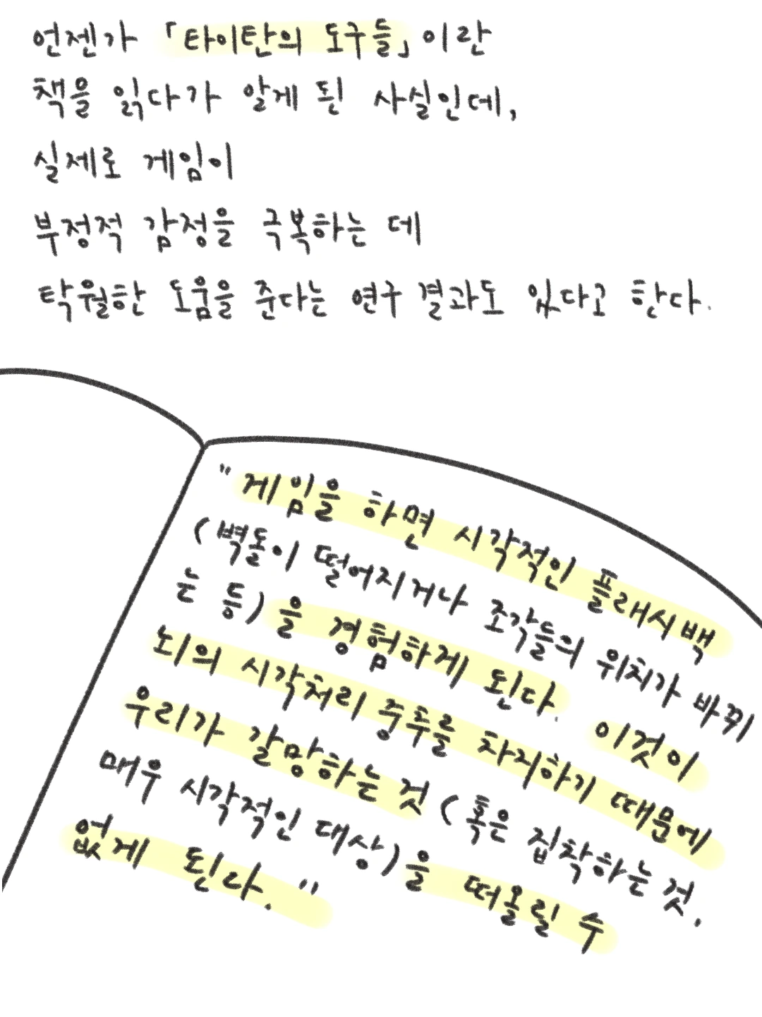 이 효과는 3~4시간 정도 지속된다. 나아가 충격적인 사건을 목격한 뒤에 테트리스를 하면 그 일이 자꾸 떠오르는 걸 막아주고 외상 후 스트레스 장애의 증상들을 완화하는 것으로 밝혀졌다."