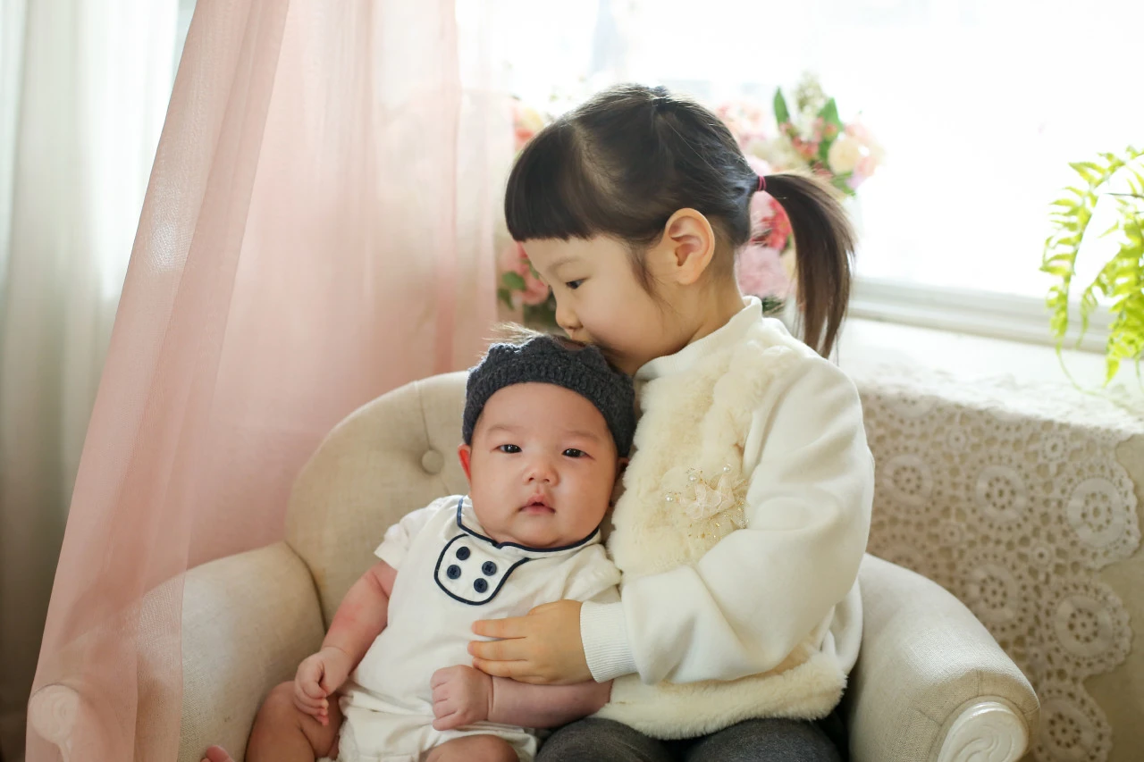 "너무 예쁘다~ 동생 이마에 뽀뽀도 한 번 해줄까?"
