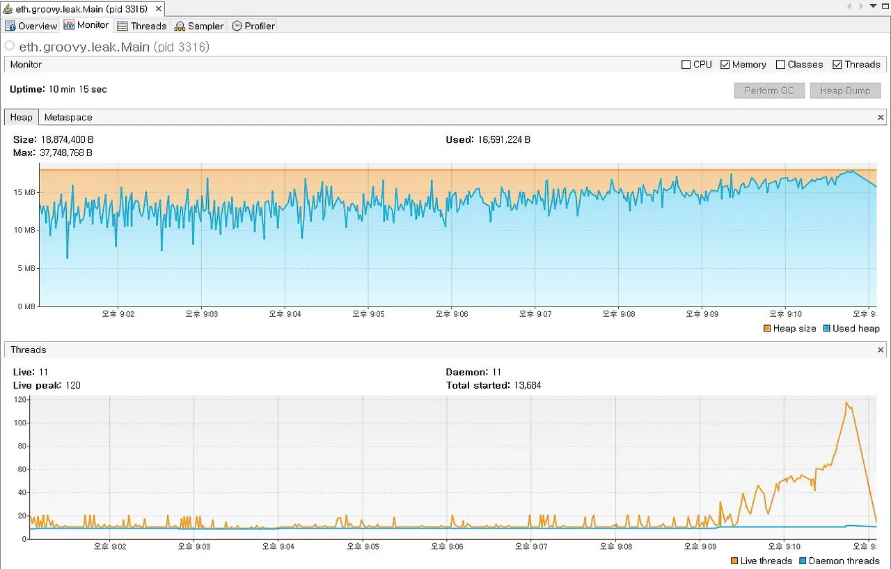 VisualVM으로 heap memory상태와 thread 갯수를 체크한다.