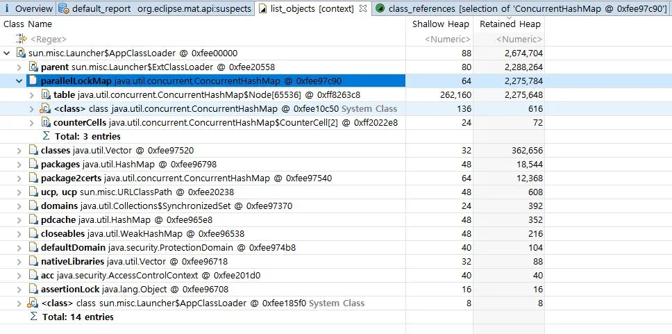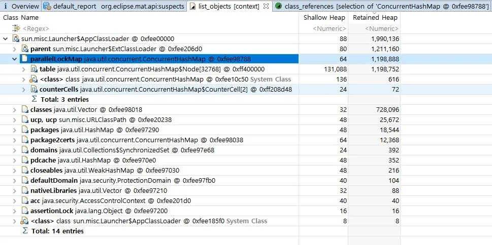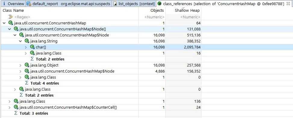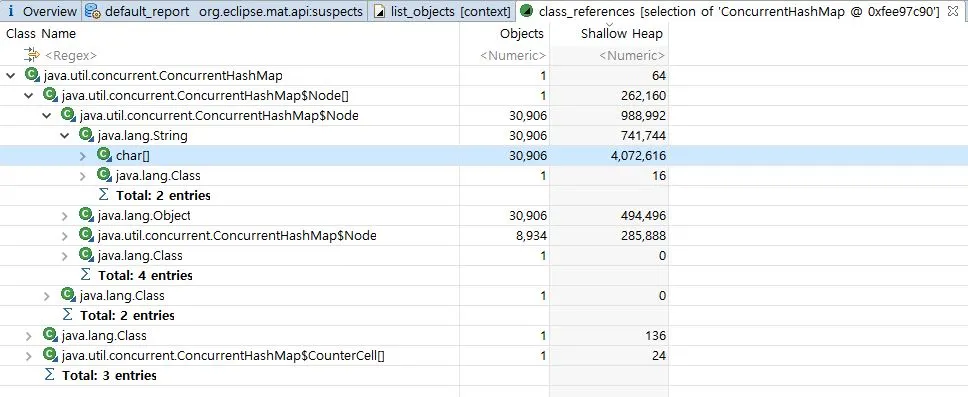 Heapdump분석을 통해서도 알수 있듯이, 3번째 예상원인이 ConcurrentHashMap에 저장된 String이라고 지목하고 있음을 알수 있습니다.