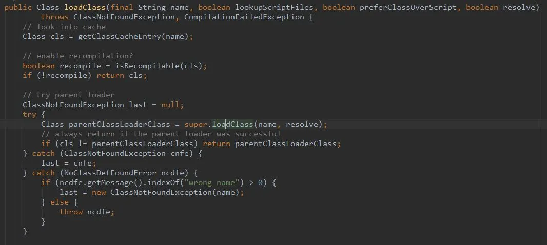 Groovy script 내에서 기존 JVM에 올라가 있는 class의 인스턴스를 생성하는 로직이 있다면, 아래의 이미지 처럼 GroovyClassLoader에서 상위 클래스로더의 loadClass()를 호출하게 되는데,