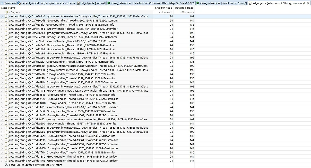 Java+Groovy 조합으로 사용하는 것이 항상 문제를 일으키는 것은 아닙니다. 위의 작성한 조건처럼 매번 파일명이 바뀌는 Groovy스크립트를 호출하고 해당 스크립트안에서 기 로드된 클래스의 인스턴스를 생성할 때 Memory leak이 발생한다는 점을 말씀드리고 싶었습니다.