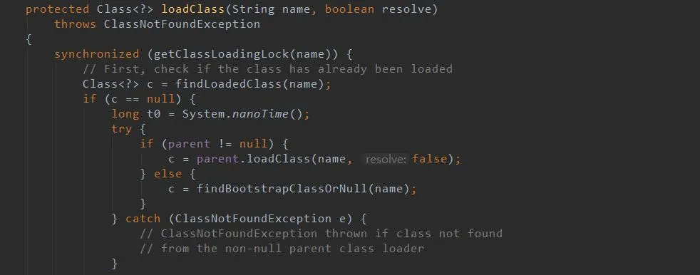 그런데 아래의 소스를 보며 유심히 관찰해보면 아시겠지만, loadClass()에서 getClassLoadingLock() 메소드에서 return된 Object에 대해 synchronized를 걸고 있음을 알수 있는데,