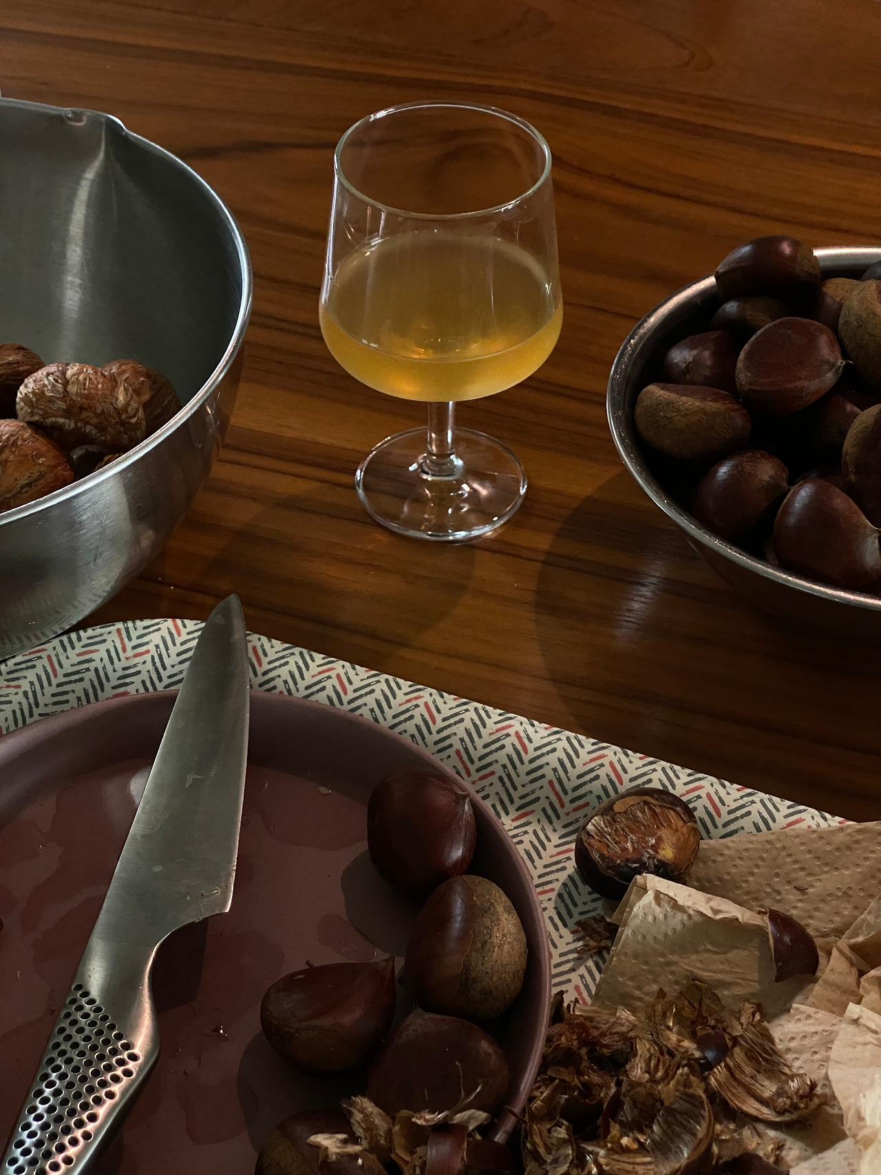 연휴 말미에 이웃언니에게 받은 밤을 손질한다. 불려둔 밤의 겉껍질을 까고 다시 속껍질을 불린다. 기다리는 시간만큼 딱딱하고 두툼한 껍질들이 유연해진다. 속살이 드러나기란 이리도 쉽지 않다. 손 바쁜 일을 하자니 입이 심심하여 잔에 와인을 한 잔 낸다. 냉장고에서 꺼낸 와인은 짙은 주황색 빛이다. 가을에서 겨울로 흐르는 마른 계절, 푹 익은 대추를 닮은 깊고 달큰한 향, 견과류 특유의 기름지고 고소한 맛이 함께 어우러져 진한 단맛을 부드럽게 감싼다.