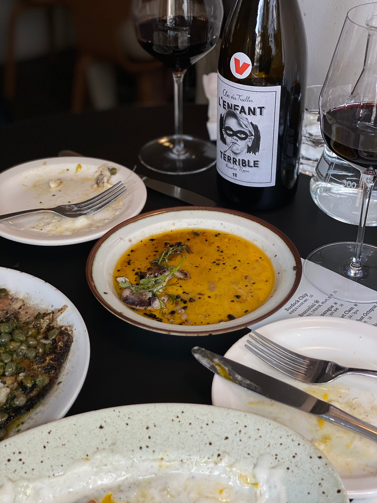 와인 추천을 위해 말씀 드린 것은 3가지, 젖은 땅 냄새가 나고, 너무 무겁지 않아 계절과 시간대에 어울리고, 한 분은 내추럴와인이 처음입니다. 3종의 와인을 가져와 설명해 주셨고, 삼촌은 와인 결정을 전적으로 내게 맡기셨다. 예상을 훌쩍 넘는 가격에 많이 놀라면서도 정신을 붙들어 메며 취향의 와인을 골랐다. 삼촌은 몰랐지만 이번엔 반드시 삼촌께 식사를 대접하고 싶었기 때문에 가격 고민을 하지 않을 수 없었다. 하지만 결론은 셋 중 가장 값이 나가는 니콜라호의 앙팡 테리블로, 선택의 가장 큰 이유는 품종이었다. 까베르네 프랑은 내가 가장 좋아하는 레드와인 품종 중 하나다. 이 품종이 가진 젖은 땅 냄새와 맑으면서도 낮은 톤의 블랙베리류 향미가 다소 라이트하고 상큼한 레드베리류 보다 오늘의 대화 톤에 어울릴 것 같았다. 또한 너무 째미하거나 해비하지 않은 질감과 바디감이 이 계절과 시간대에 더 풍부하게 잘 살아나리라 생각했다. 선택의 또 한 가지 이유는, 깔끔한 와인 레이블과 가격에서 느껴지는 아우라였다. 그것은 누군가의 첫 내추럴와인 경험에 모자람이 없을 것이란 확신을 내게 주었다. 삼촌처럼 컨벤셔널 와인을 즐겨 드시던 분이라면 밸런스 면에서 그 문턱이 분명히 있을 터. 금액적 부담은 있었지만 맛에 대한 확신이 더 중요했다. 물론 일상의 오아시스 같은 이런 한낮의 와인이 맛까지 좋다면 내게도 금상첨화이니 일단 즐겨보자 싶었다.