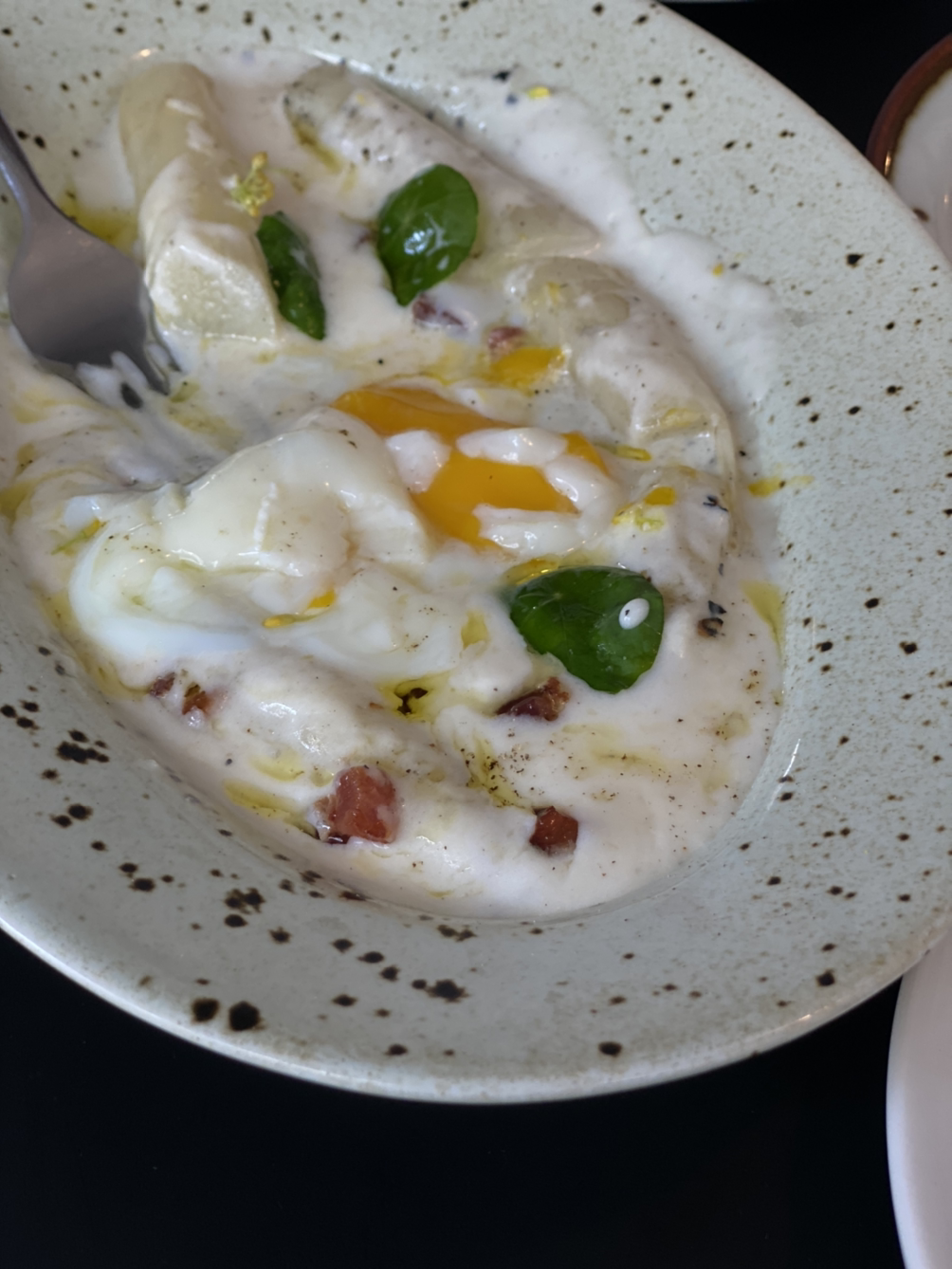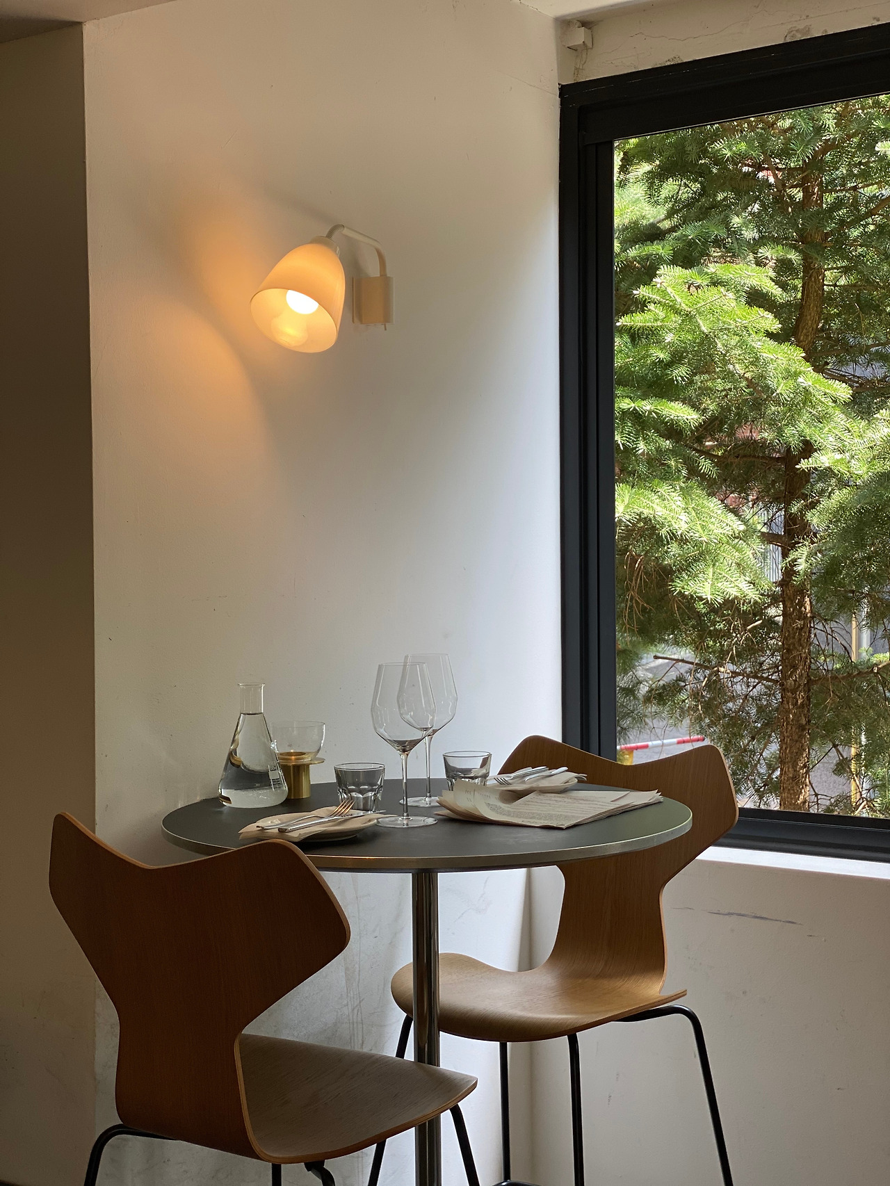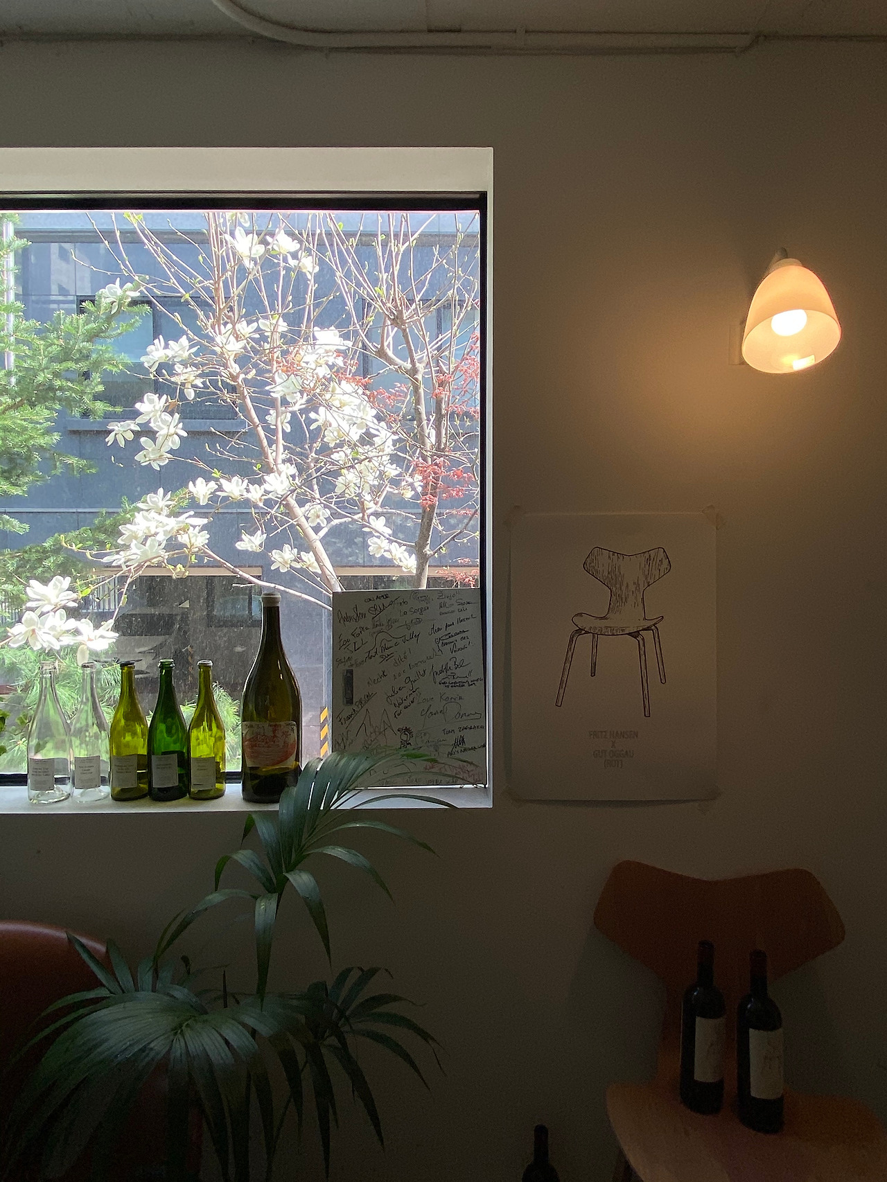 주말 오픈 시간은 2시. 빅라이츠는 주말 낮술이 가능한 와인바다. 안내 받은 둥근 원형 테이블에 하이체어가 배치된 자리에 앉았다. 실내 공간은 예상만큼 좋았다. 가구들은 프리미엄 북유럽 브랜드인 프리츠한센으로 구성되어 있었다. 이 브랜드를 잘은 모르지만 한낮의 빅라이츠를 보니 맨 먼저 세련되고 쿨하다고 느껴졌다. 얇은 크리스탈 와인잔, 비커 모양의 물병과 군더더기 없는 한 장의 메뉴판, 모든 게 투명하게 빛나는 원형의 블랙테이블은 지나치게 말끔하고 도시적이다. 여기에 밝은 톤의 우드 체어는 자칫 날카로울 수 있는 분위기를 부드럽게 감싸준다. 와인바 곳곳의 식물과 주광색 조명, 작은 액자와 그림이 그려진 종이들이 벽에 귀엽게 매달려 위트와 온기를 더해준다. 인테리어적으로 온전히 취향 저격이랄까. 세련되면서도 부드러운 공간이다. 시각적인 만족과 함께 편안하게 음식과 술을 할 수 있는 공간이라는 점에서 더 기대가 되었다. 눈 앞에 통유리 안으로 보이는 어두운 공간에선 쉐프들이 바쁘게 움직이고 화덕의 불꽃은 붉게 빛났다. 흘러나오는 음악을 들으며 그 모습을 보고 있자니 마치 무성영화를 보는 듯 느껴졌다. 그러다 자켓을 벗어 드러난 목덜미에 바람이 스치면 뒤 돌아 문이 열린 커다란 창 밖으로 흔들리는 하얗고 큰 얼굴의 목련들을 한참이고 보았다. 봄 햇살이 수 많은 꽃 잎사귀 위에서 반짝거렸다. 봄이었고, 나는 한낮의 술과 대화에 꽤 들떠 있었다.
