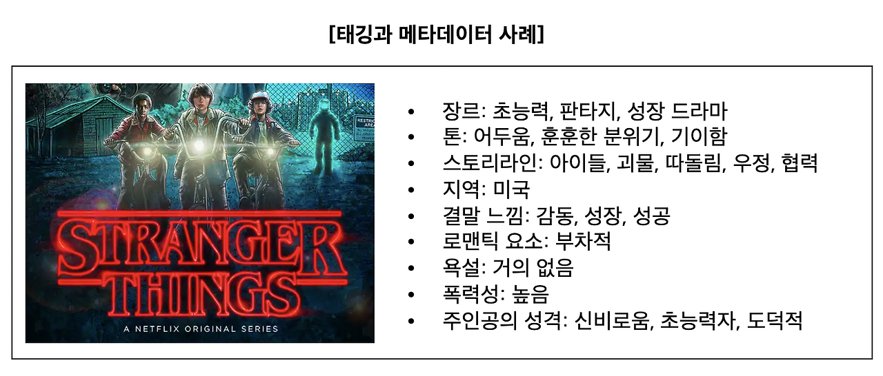 위 그림은 태거들의 인터뷰를 기반으로 만든 "기묘한 이야기"의 태깅 사례입니다. 콘텐츠의 장르와 톤에서부터 인물의 성격과 도덕 수준까지도 태깅합니다.
