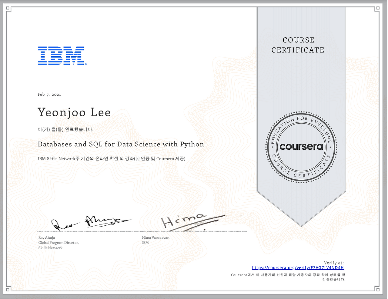 Coursera (코세라)에서 강의 두 개를 수료했습니다.