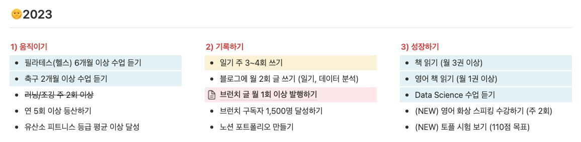 이 글은 연초에 세운 2023년 계획을 얼마나 잘 수행했는지 평가하는 글입니다. 목표 유형 세 개(움직이기, 기록하기, 성장하기) 중 움직이기를 제외하고는 주로 성취하지 못한 목표를 찾고 해결방법을 고민하는 내용을 담았습니다.