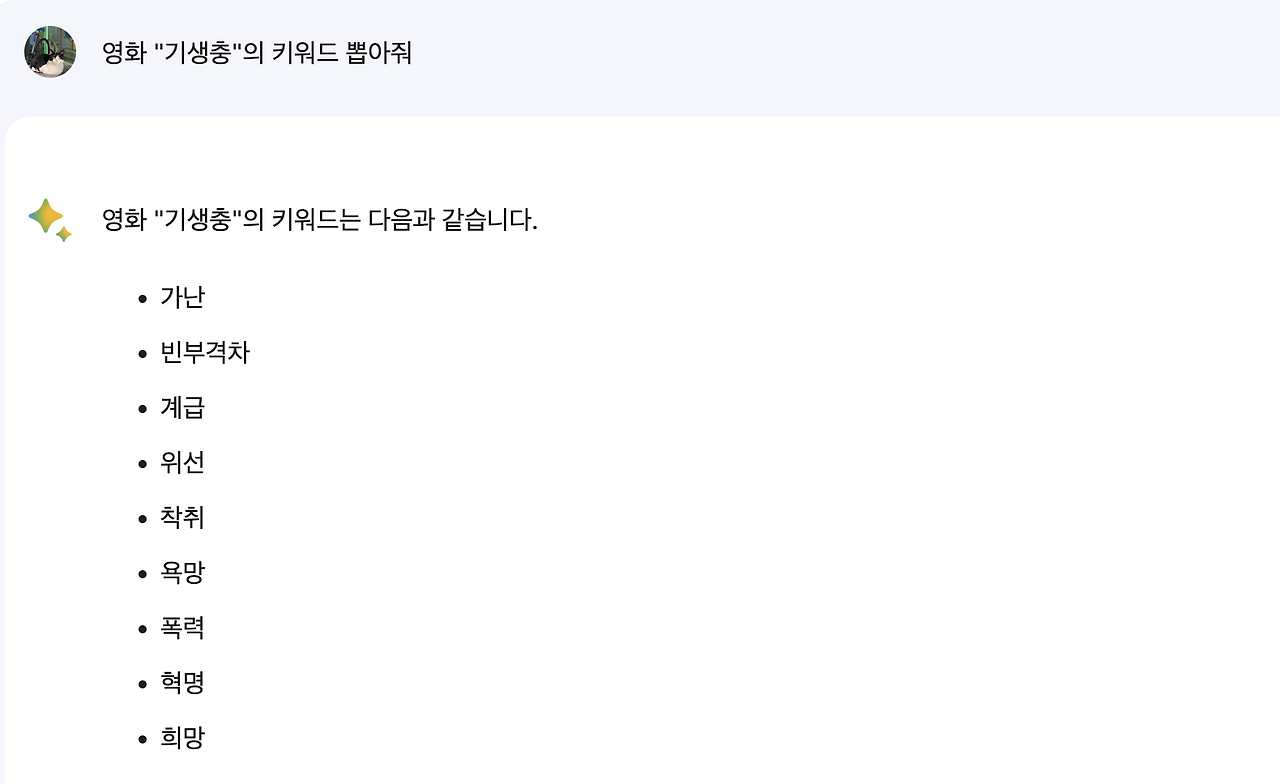 생성형 AI에게 콘텐츠의 키워드를 뽑아달라고 하는 것은 쉽다. "영화 기생충의 키워드 뽑아줘"라는 프롬프트로 결과를 바로 받을 수 있다. 그러나 아래 결과가 좋은 키워드라고 할 수 있을까?