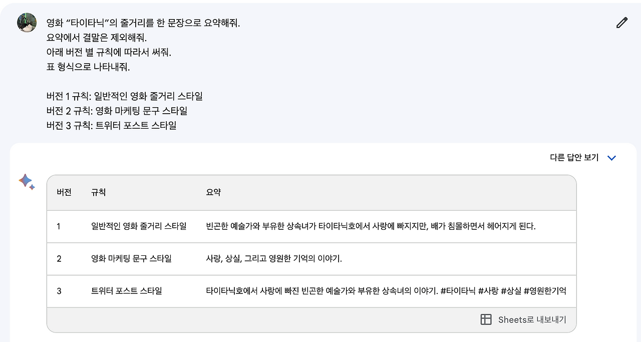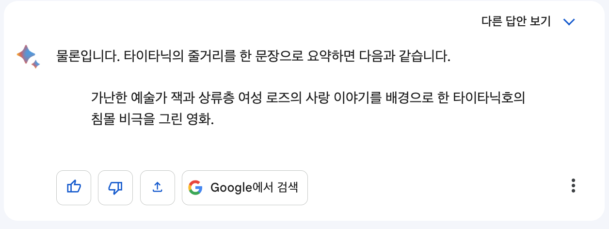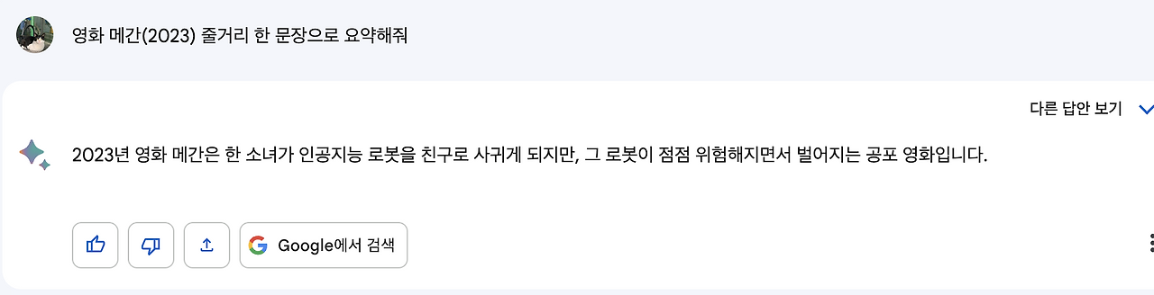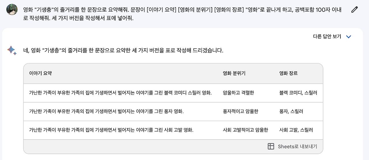 줄거리의 형식을 한 가지 추가했다. 장르 + "영화"로 문장이 끝나게 요청했다. 글자 수도 제한했다. "다른 답안 보기"를 클릭해도 BARD가 제공하는 요약문은 모두 같은 형식으로 끝난다.