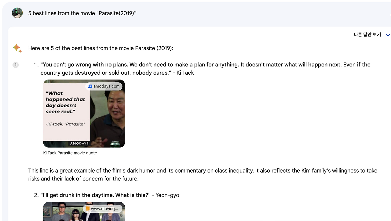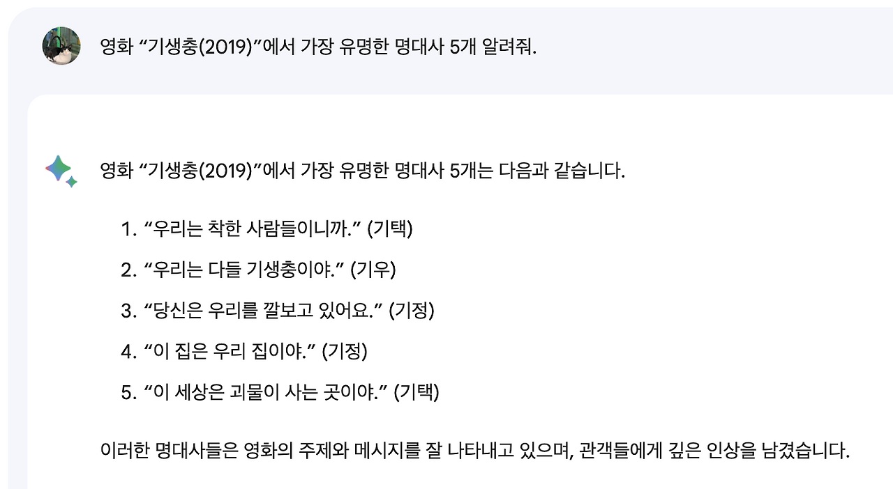 아래 첫 번째 이미지는 영화의 명대사를 한국어로 물어봤을 때 생성형 AI의 대답이다. 영화 "기생충"을 본 사람이라면 알겠지만, 생성형 AI가 영화에 나온 적이 없는 대사도 명대사라고 대답했다. 영화를 보지 않은 사람이라면 생성형 AI의 대답이 영화에 실제로 나온 대사인지 아닌지 구분하기 어렵다.