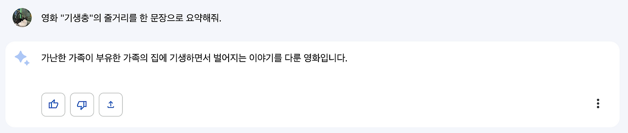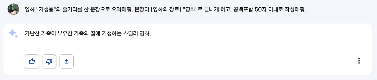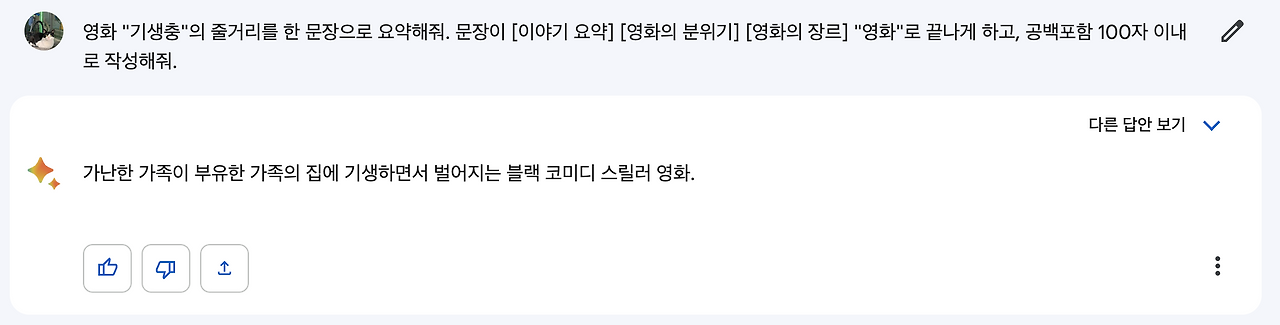 1차로는 별 다른 규칙 없이 영화 "기생충"의 줄거리를 한 문장으로 요약해 달라고 했다. 나쁘지는 않다. 그러나 영화 요약이 "~입니다"로 끝나는 것을 원하지 않기 때문에 문장의 형식 규칙을 추가했다.