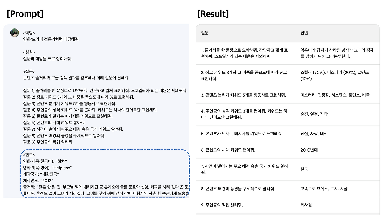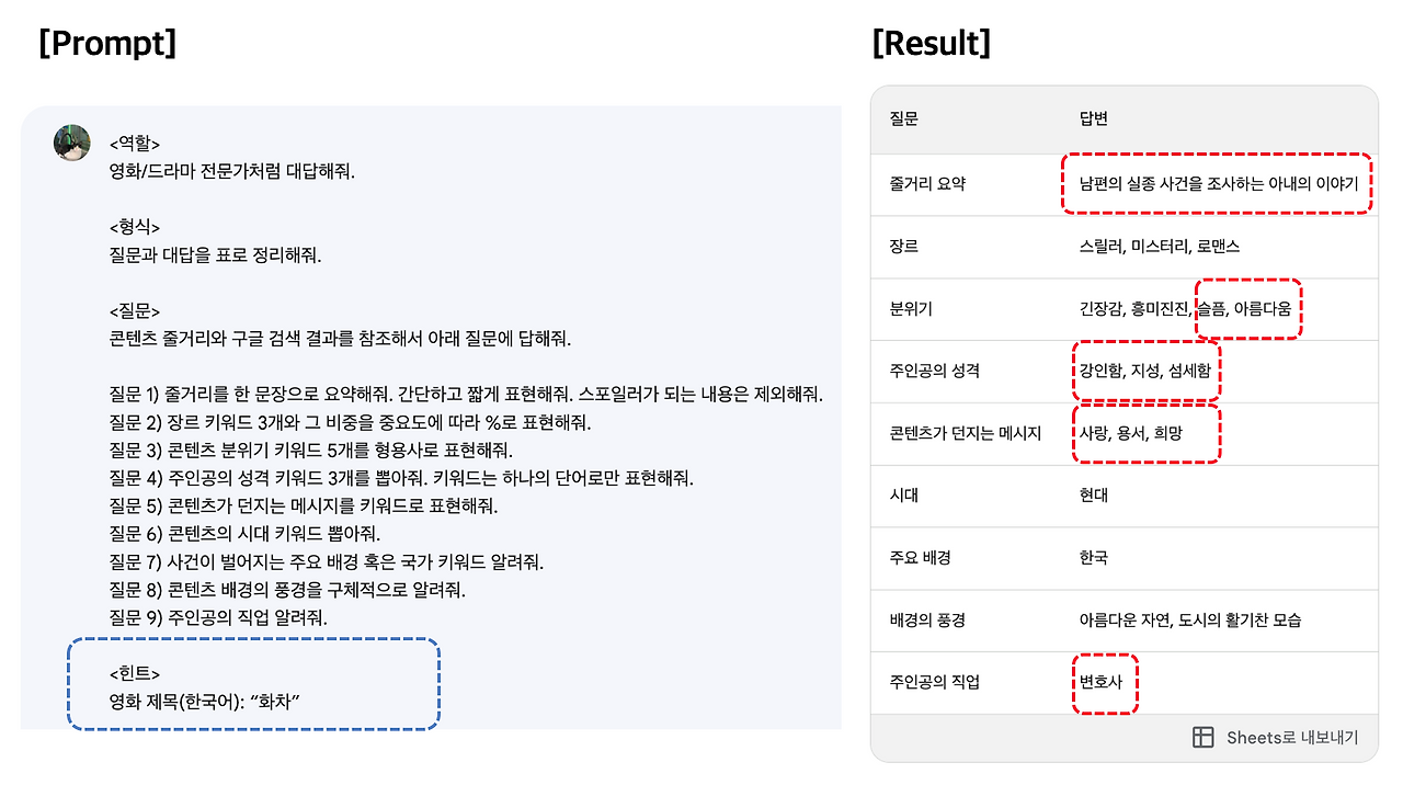 - 국내 콘텐츠인 경우 구글이 갖고 있는 정보가 적기 때문에 충분한 양의 힌트를 주지 않으면 환각이 발생할 확률이 높다.