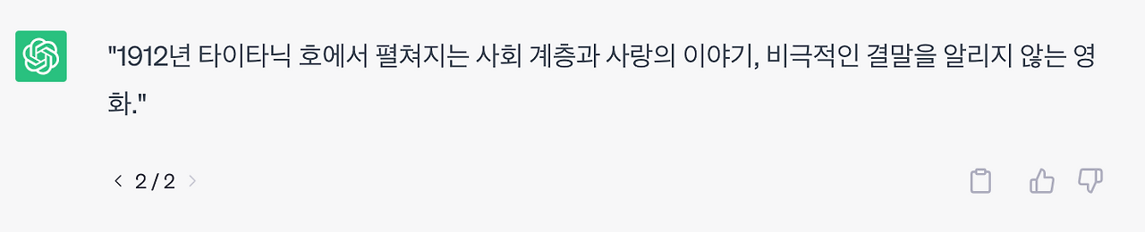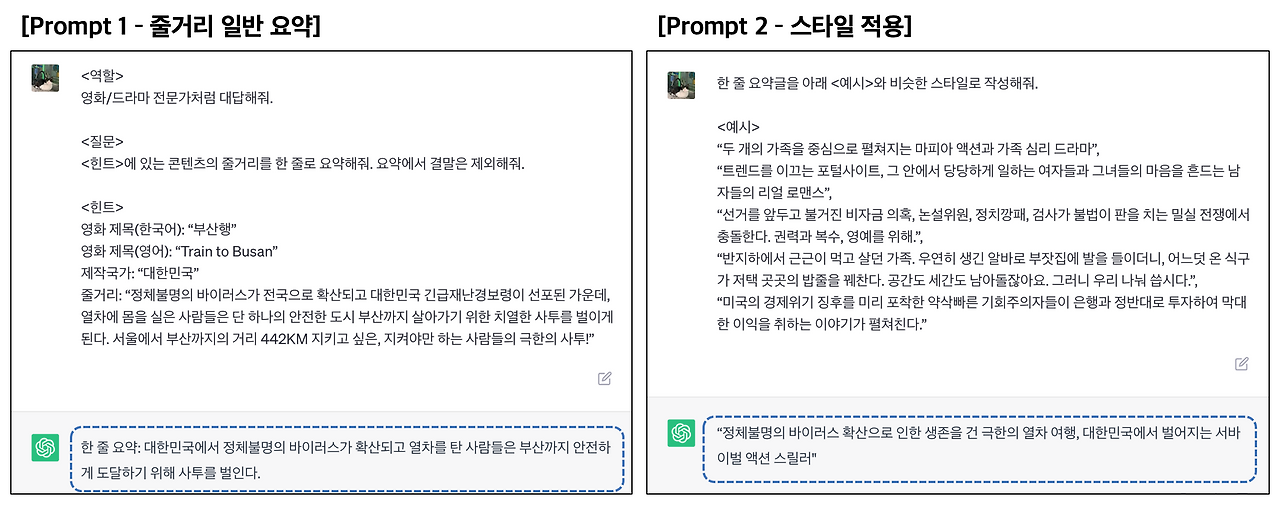 - 버전 2), 3)의 경우, 고객에게 영화 시청을 설득하는 줄거리이길 바랐는데, 콘텐츠의 내용을 요약하는 데 그쳐 질문을 더 구체화했다.