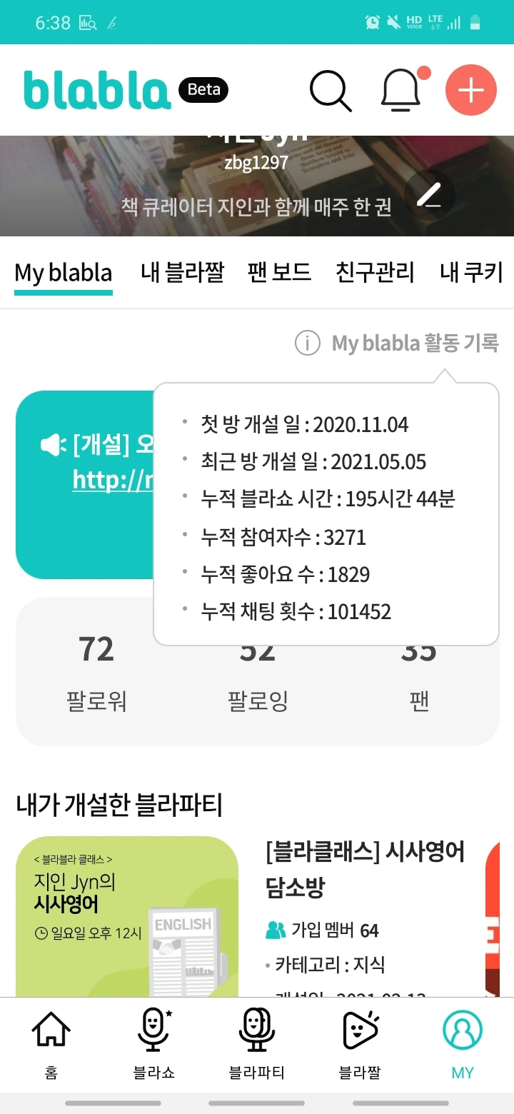 블라블라에서 첫 방송 개설일이 2020년 11월 4일이라고 나오네요. 누적 시간 195시간 44분, 누적 참여자 수 3,271명. 누적 좋아요 수 1,829개, 누적 채팅 횟수 101,452개.