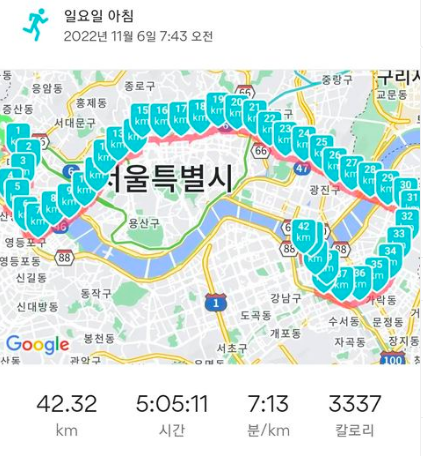 2022년 11월 6일, 새벽 4시 알람을 7개나 맞춰놓고 첫 번째 알람이 울리지마자 바로 잠에서 깼다. 갑자기 바뀐 풀코스 노선으로 인해 집에서 상암월드컵경기장까지 가려면 지하철 첫 차를 타야만 했다. 요즘은 침대에 눕자마자 5분 안에 잠들어 버리기 때문에 전날 아무것도 준비하지 못했다. 4시에 일어나자마자 샤워를 하고 가방 안에 바나나 2개와 물, 근육 마사지 크림, 카드와 핸드폰 그리고 물품 보관용 플라스틱백만 챙기고 나왔다.