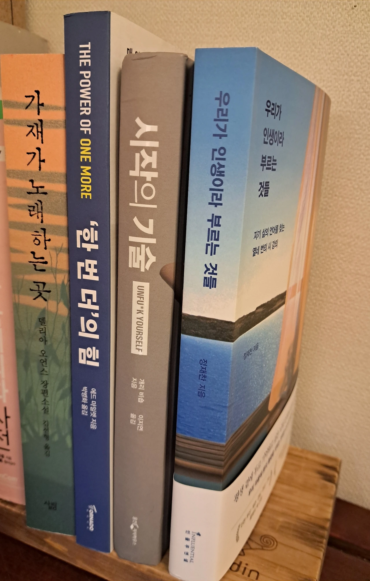이번 주는 두 달 전에 읽다가 스톱해 버린 <가재가 노래하는 곳>, 현재 전 세계적으로 인기를 끌고 있는 두 자기 계발/개발 강연자 에드 마일렛과 개리 비숍의 <'한번 더'의 힘>과 <시작의 기술> - 일명 "그딴 소똥 짓 좀 그만해"책 - 그리고 도서 증정으로 받은 <우리가 인생이라 부르는 것들>이다.