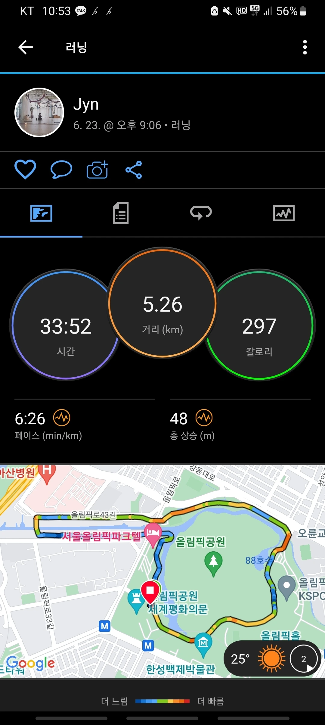 6월 23일 금요일 기록. 오전은 늘 그렇듯 모닝런 5km, 그리고 저녁 때는 처음으로 다른 크루와의 콜랍런, 일명 콜라보레이션 러닝. 올림픽공원에서 5.26km.