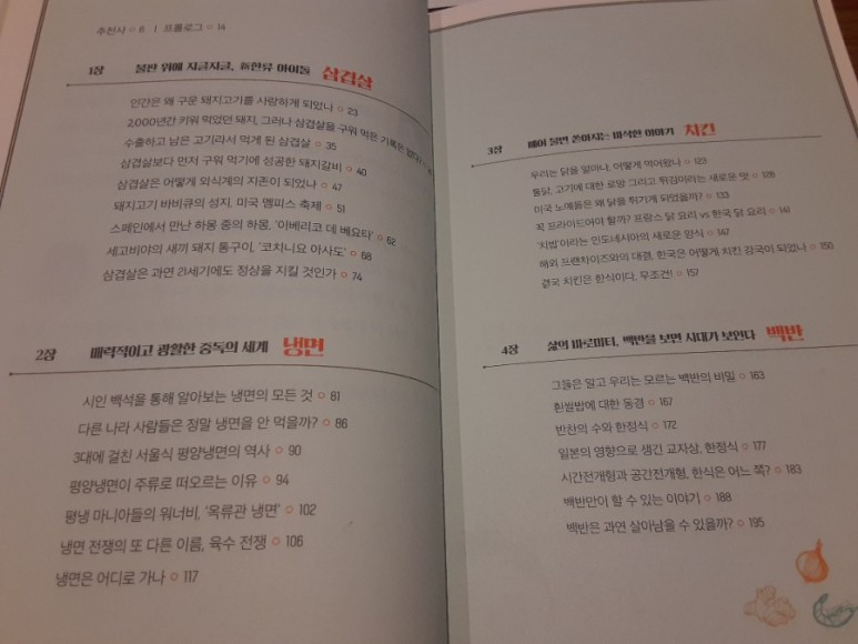 이 책의 유일한 단점이라면 읽으면 읽을 수록 점점 더 배가 고파진다는 사실이다. (그러니 방송으로 보면 얼마나 무시무시한 일이 벌어질까....) 삼겹살에 대한 글을 읽을 때는 삼겹살이, 냉면에 대한 글을 읽을 때는 냉면이, 치킨을 읽을 때는 치킨이, 백반에 대해 읽을 때는 백반이.... 이렇게 줄줄이 식탐이 이어진다. 식단 조절 중인 사람이라면 조심스럽게 독서 유보를 권유하고 싶다.
