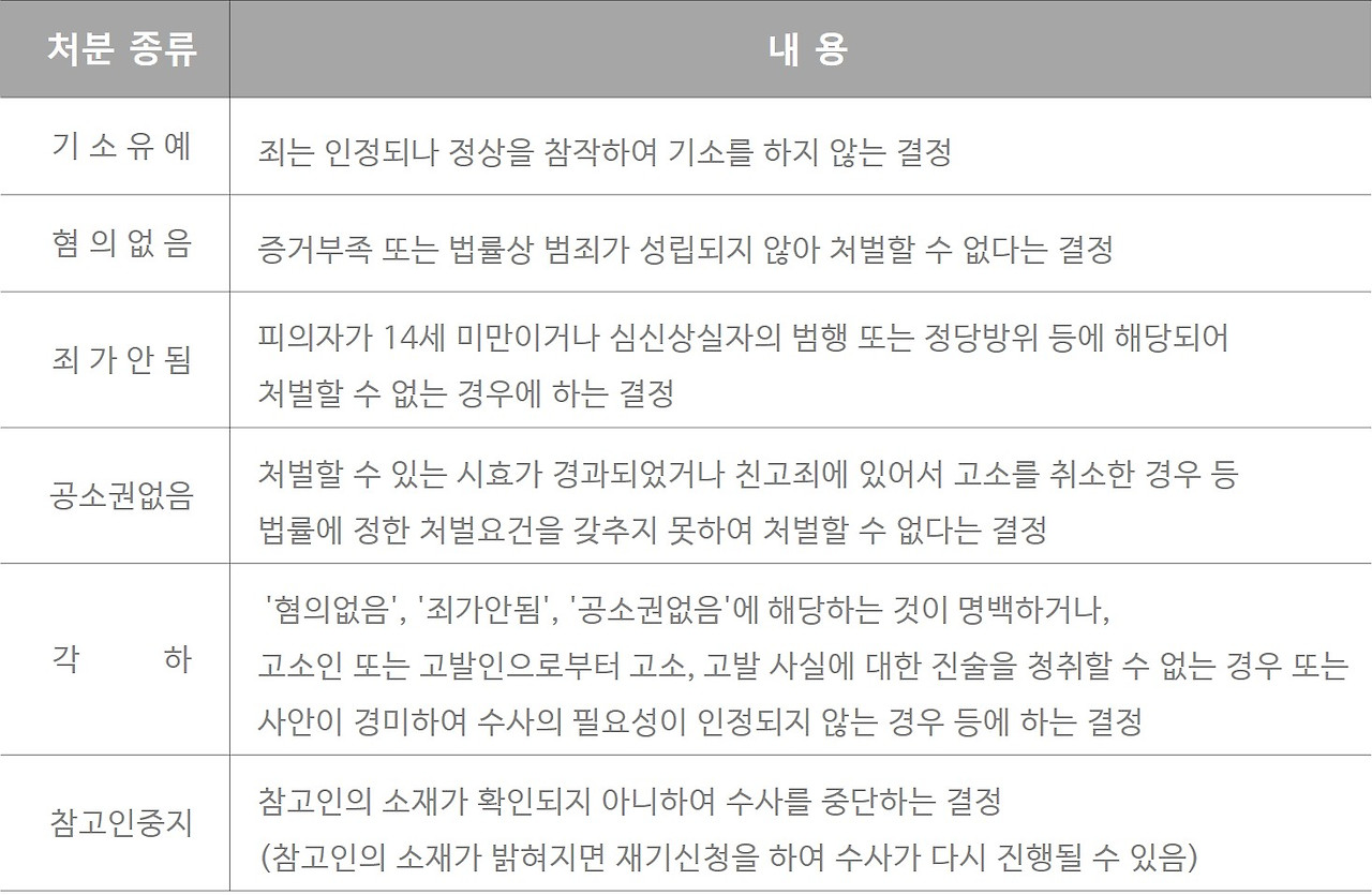 불기소처분은 검사가 공소제기를 하지 않겠다는 것을 의미하는데, 그 종류는 다음과 같습니다.