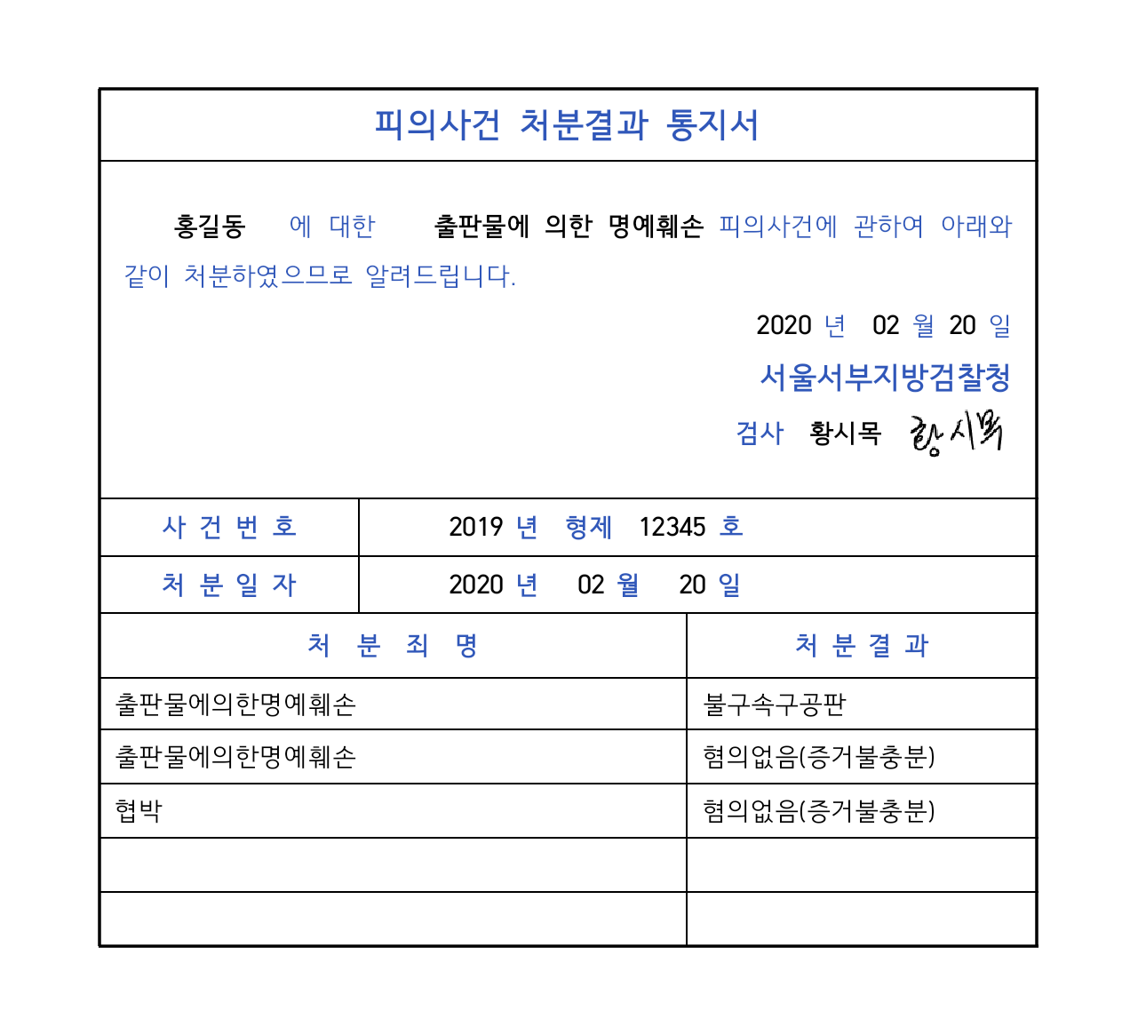 위 통지서의 경우, 피의자 '홍길동'에 대하여 두 개의 출판물에 의한 명예훼손죄와 협박죄에 관하여 수사가 진행되었고, 그 결과 2020. 2. 20. 서울서부지방법원 황시목 검사에 의하여 하나의 출판물에 의한 명예훼손 사실에 대해서는 '불구속구공판' 처분을, 다른 하나의 출판물에 의한 명예훼손 사실에 대해서는 증거가 불충분하여 '혐의없음' 처분을, 협박 사실에 대해서도 증거불충분을 이유로 '혐의없음' 처분이 내려졌다는 것을 알려주고 있습니다.