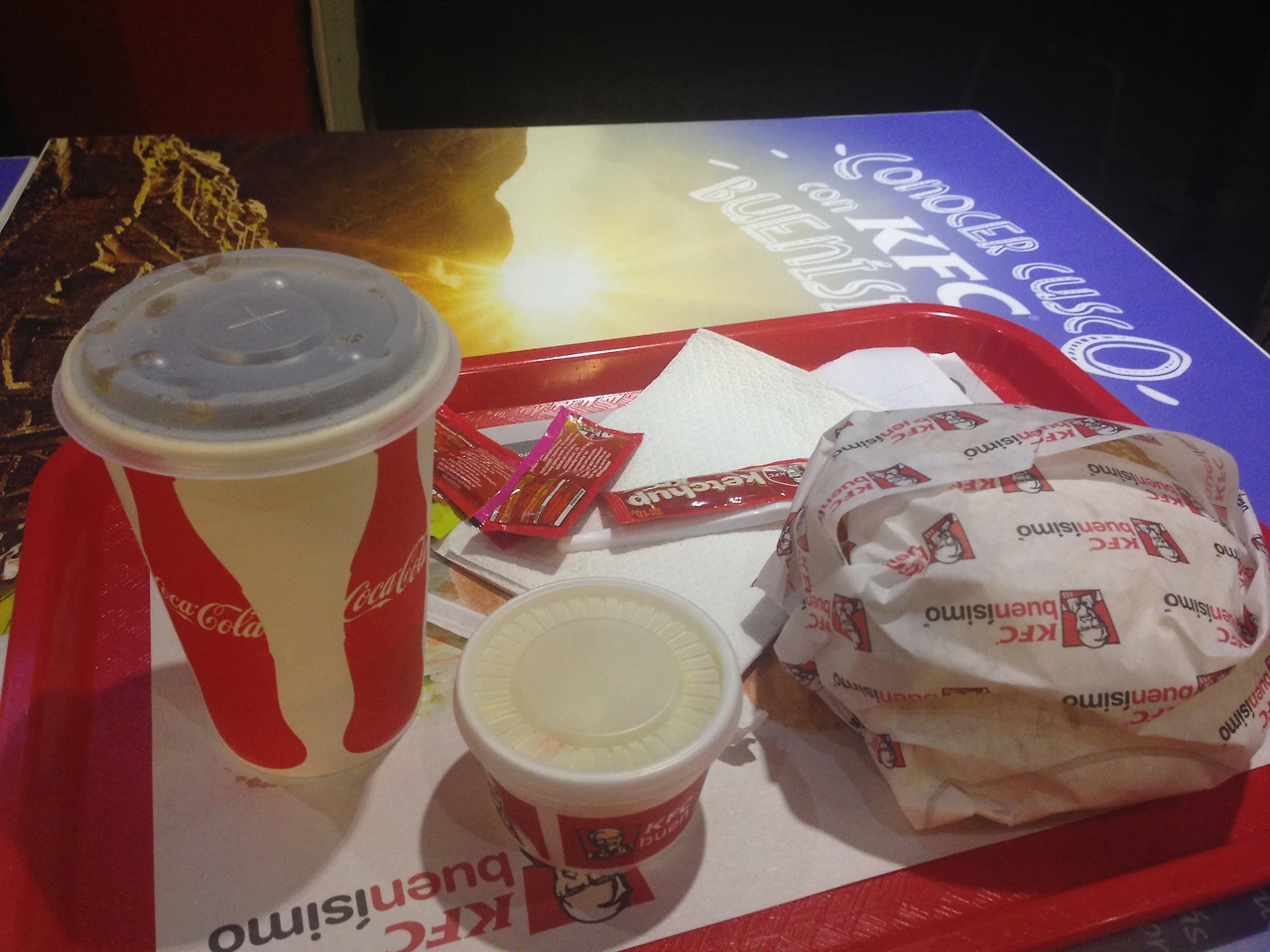 왠지 다국적 프랜차이즈를 가면 지는 느낌이 드는 것도 사실이었으나, 볼리비아 코파카바나에서 만난 여행자분이 세상에 그렇게 맛있고 바삭한 치킨 버거를 먹어 본 적이 없다며 (이 분 나만큼 여기저기 먹고 다니시는 분은 아닌 듯;;) 쿠스코에 가면 꼭 KFC에 가라고 한 게 기억이 나서 아르마스 광장에서 멍 때리고 있으면서 애써 외면했던 KFC에 입성했다.