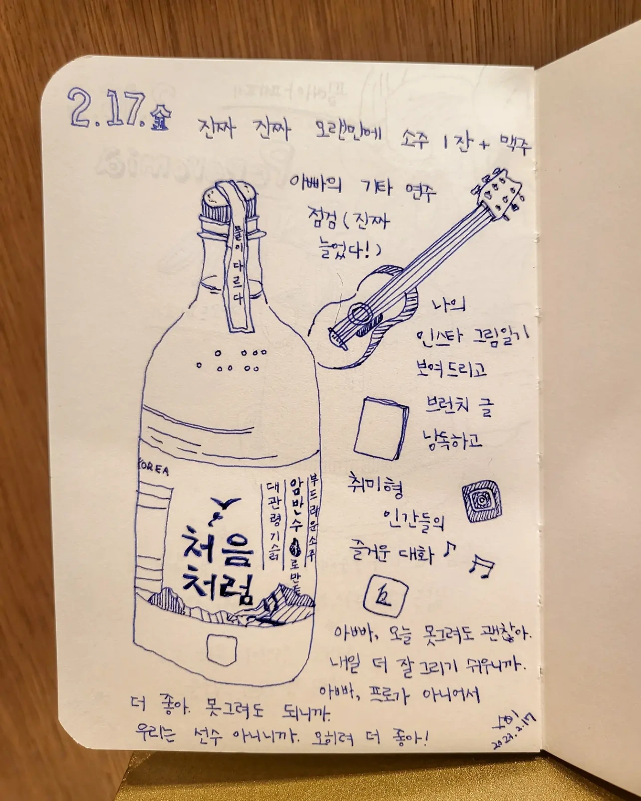 아빠는 2주간 더 연습한 기타 연주를 선보였고 나는 내 그림일기를 보여드리고 내 브런치 글 <나보다 어린 엄마에게>를 낭독했다. 아빠는 내 긴 글을 귀 기울여 들어주었고, 다 읽고 고개를 들었을 때 눈가가 조금은 촉촉해진 듯했다. "잘 썼다. 우리 딸답네."라고 말했다.