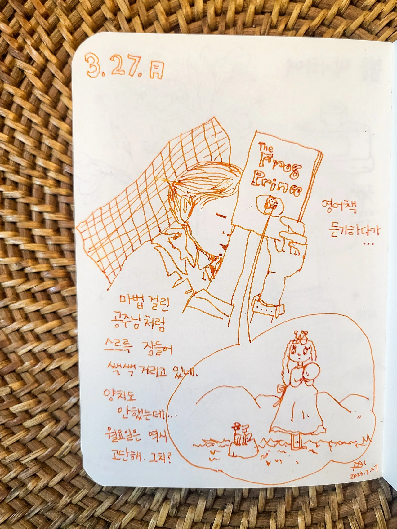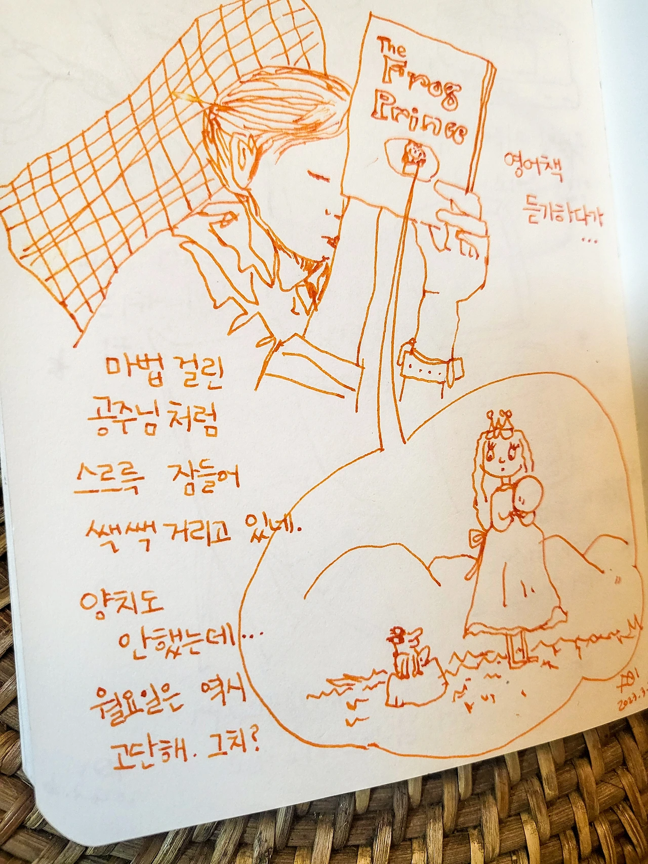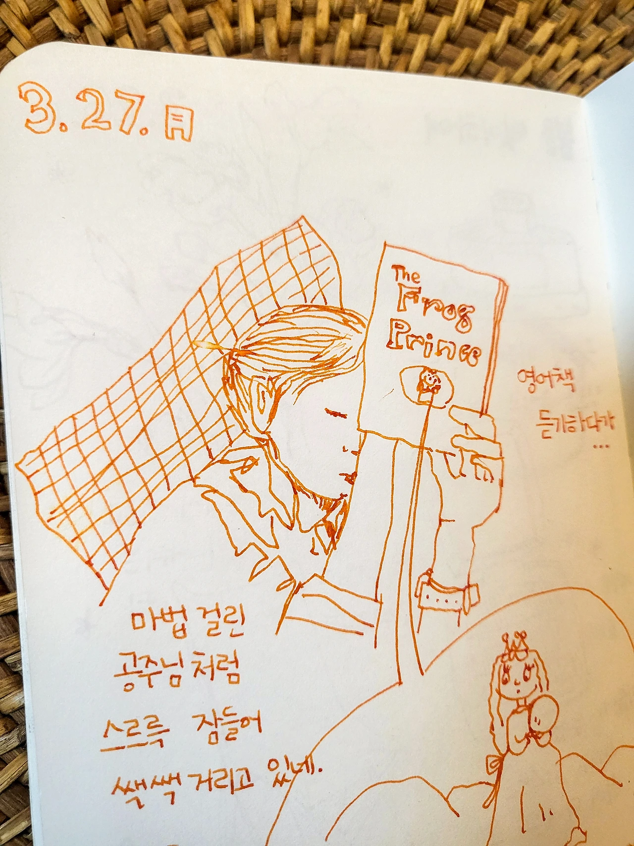 마침 잠든 꼬마를 보고 쓱싹쓱싹 그렸던 어제의 밤.