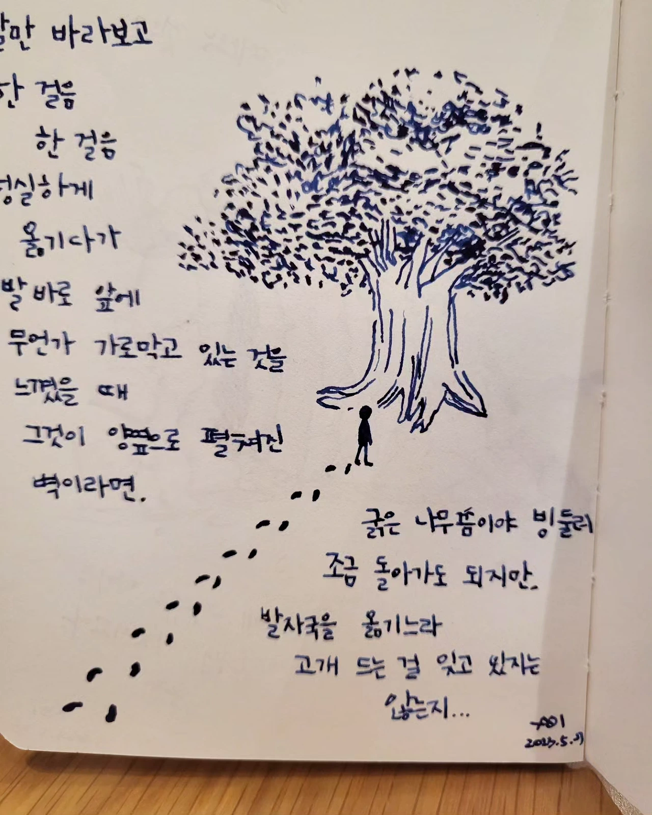 내 발등만 바라보고 걷느라 몰랐는데 발등 앞에 툭 걸리는 벽이 보인다.