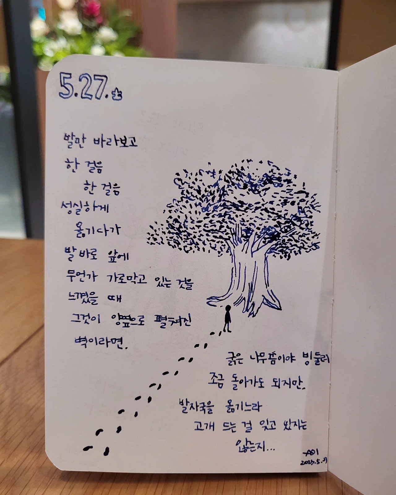하루간 애써 옮긴 한 발짝에 자조하며 발등만 바라보고 걷고 있는 것은 아니었는지 묻는다.