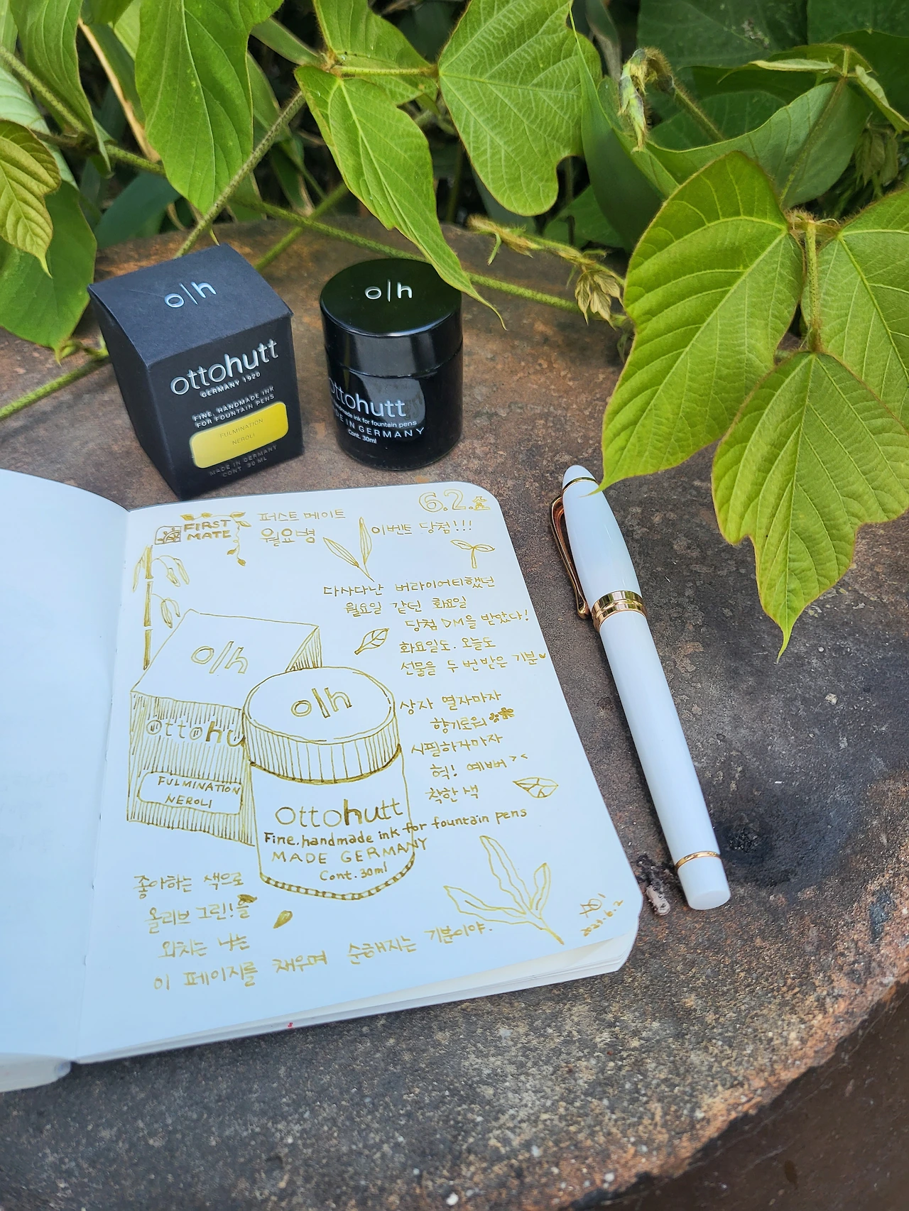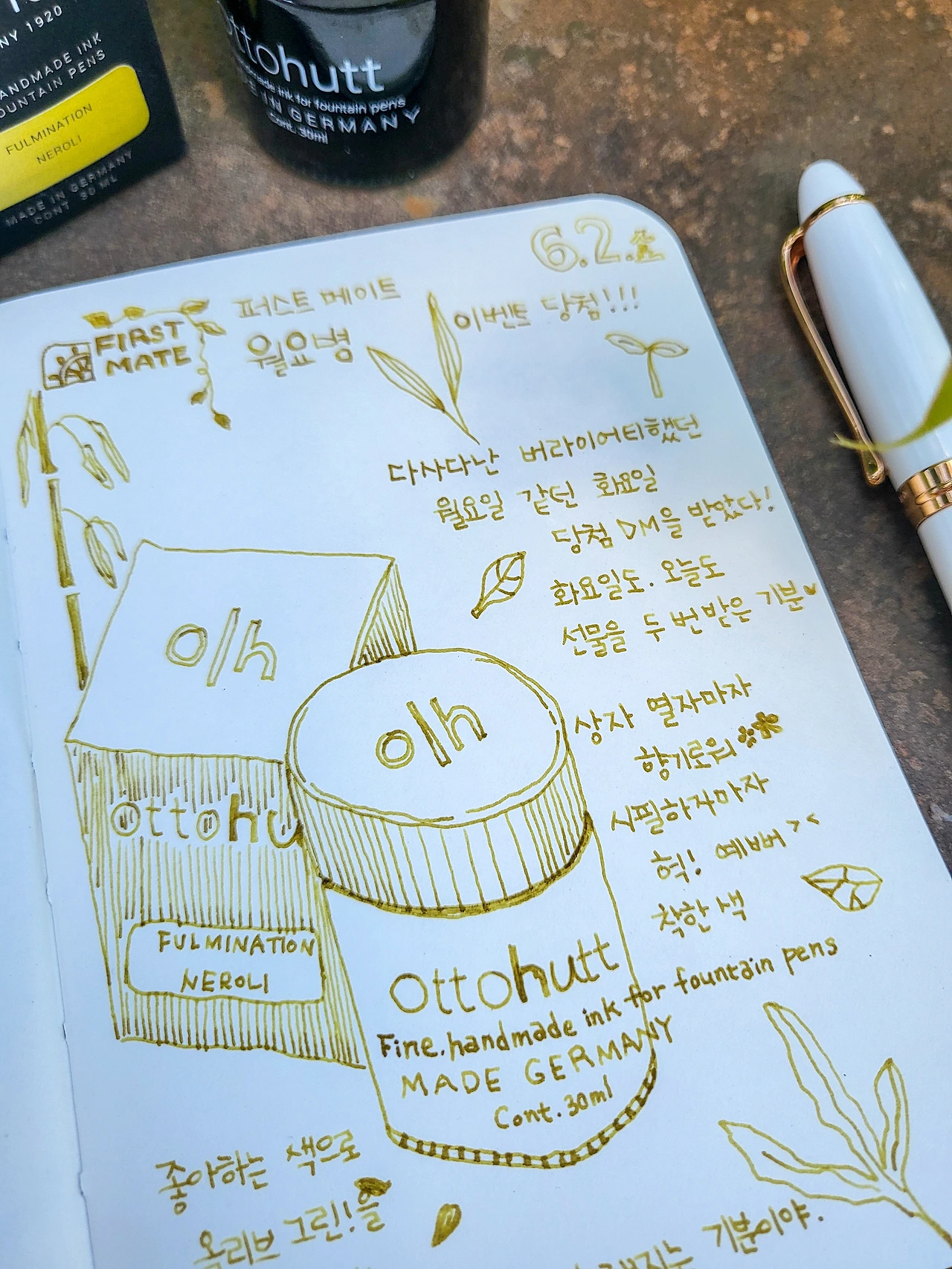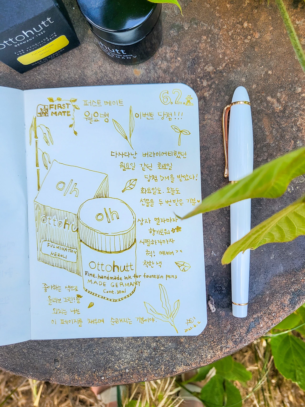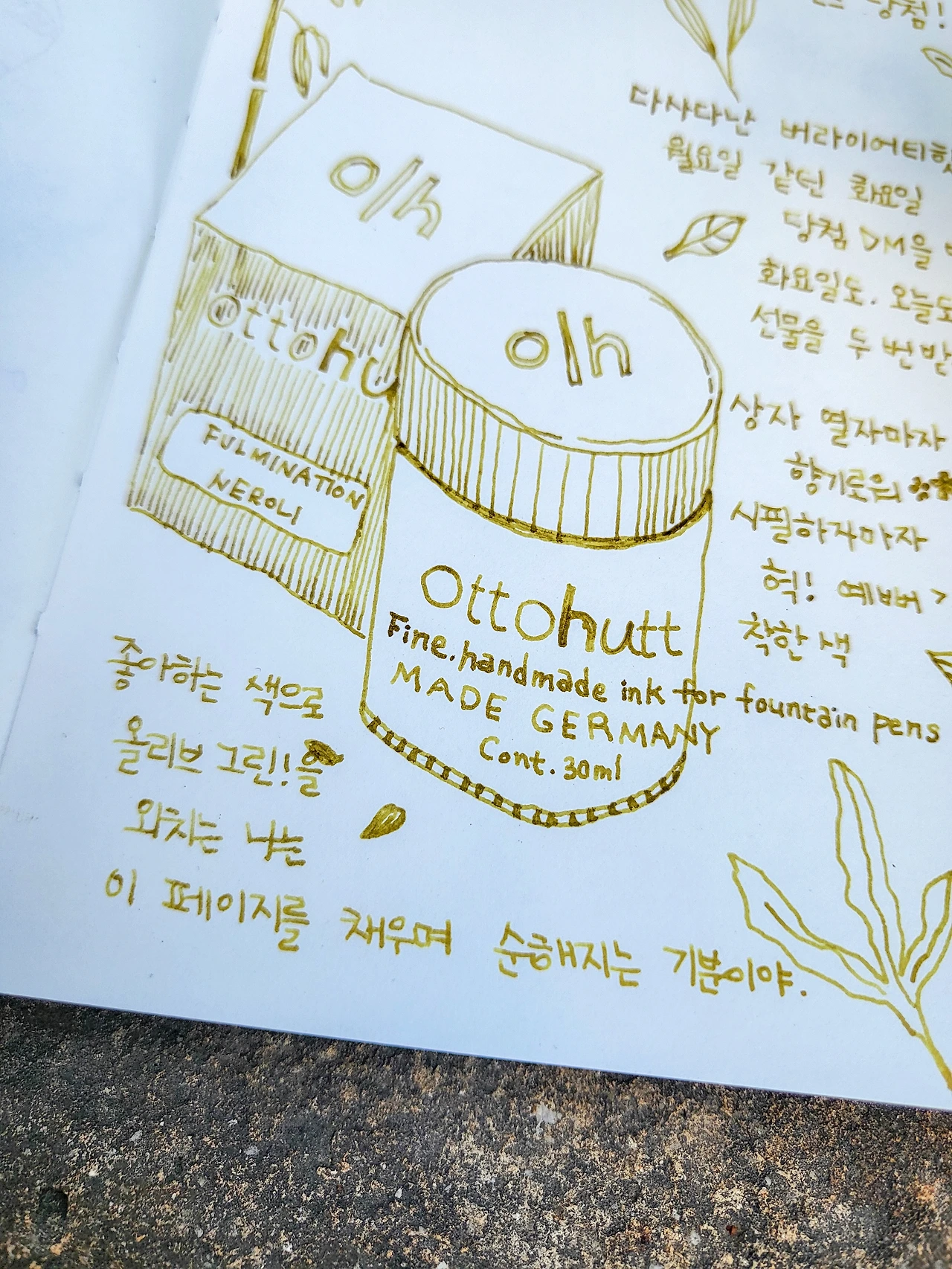 지쳤던 지난 화요일, 이벤트에 당첨되어 금요일에 이 잉크를 받게 되었다. 조신하게 세척하고 기다렸던 오로라 만년필에 새 잉크를 넣고 첫 시필을 하는 순간.