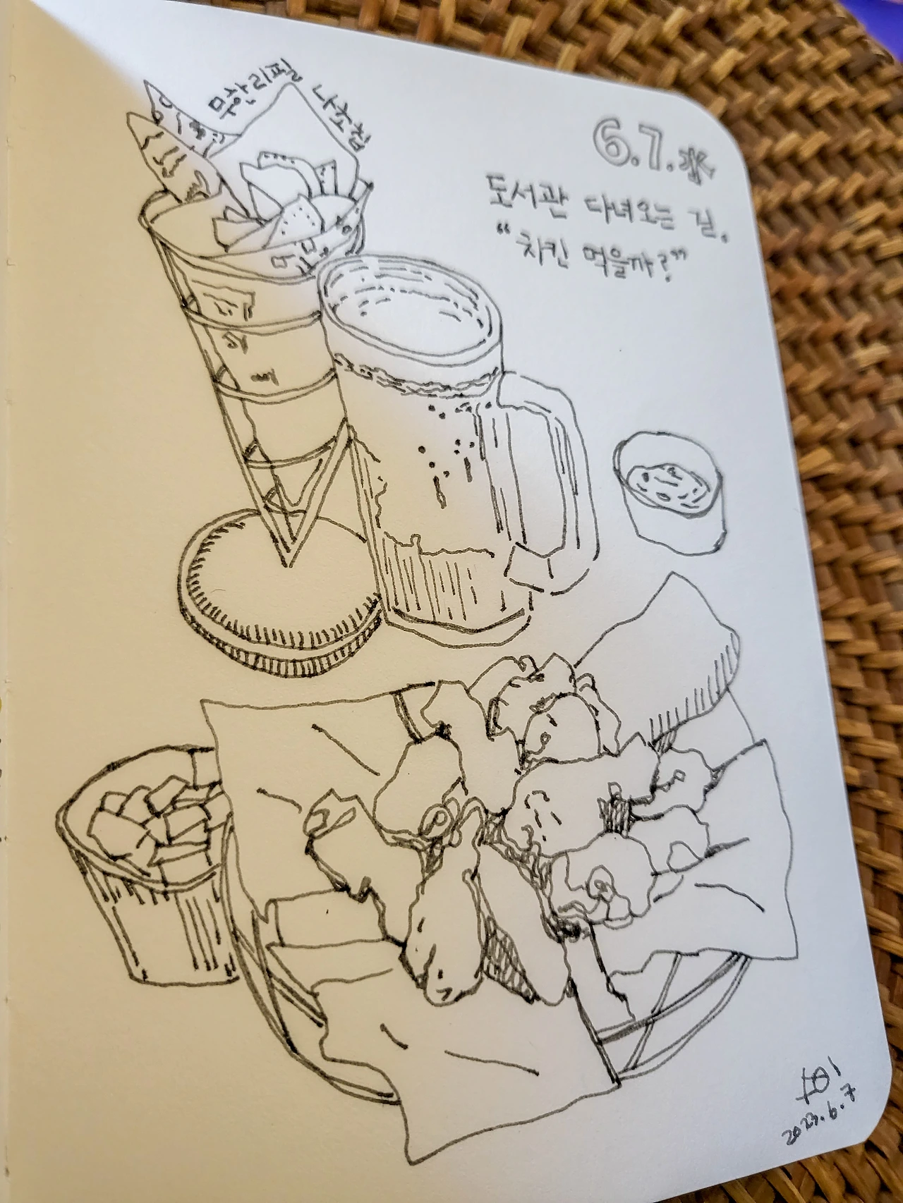 파삭이는 나초와 나와서 먹으니 더욱 바삭하고 뜨거운 치킨, 나에게만 허락되어 재미는 덜한 맥주 한 잔이었지만
