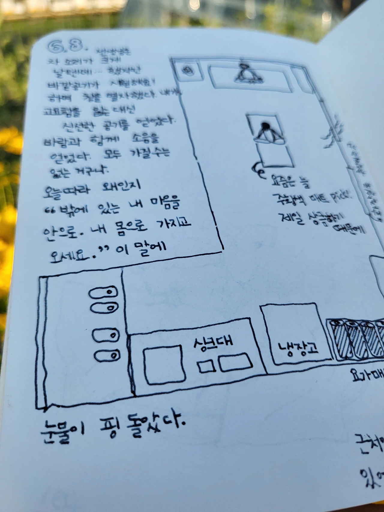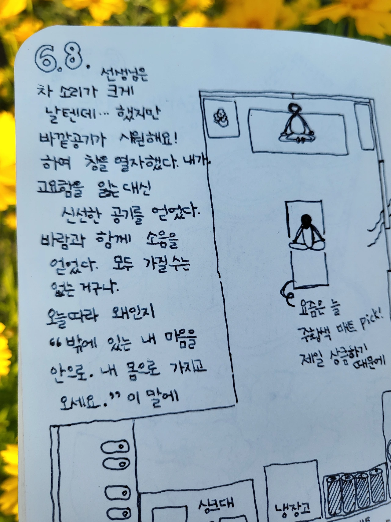 "밖에 있는 내 마음을 내 몸으로 가지고 오세요."라고 나지막이 말하는 선생님 말씀에 순간 눈물이 핑 도는 느낌이 들었다. 많이는 아니고 아주 조금. 길게는 아니고 아주 짧게.