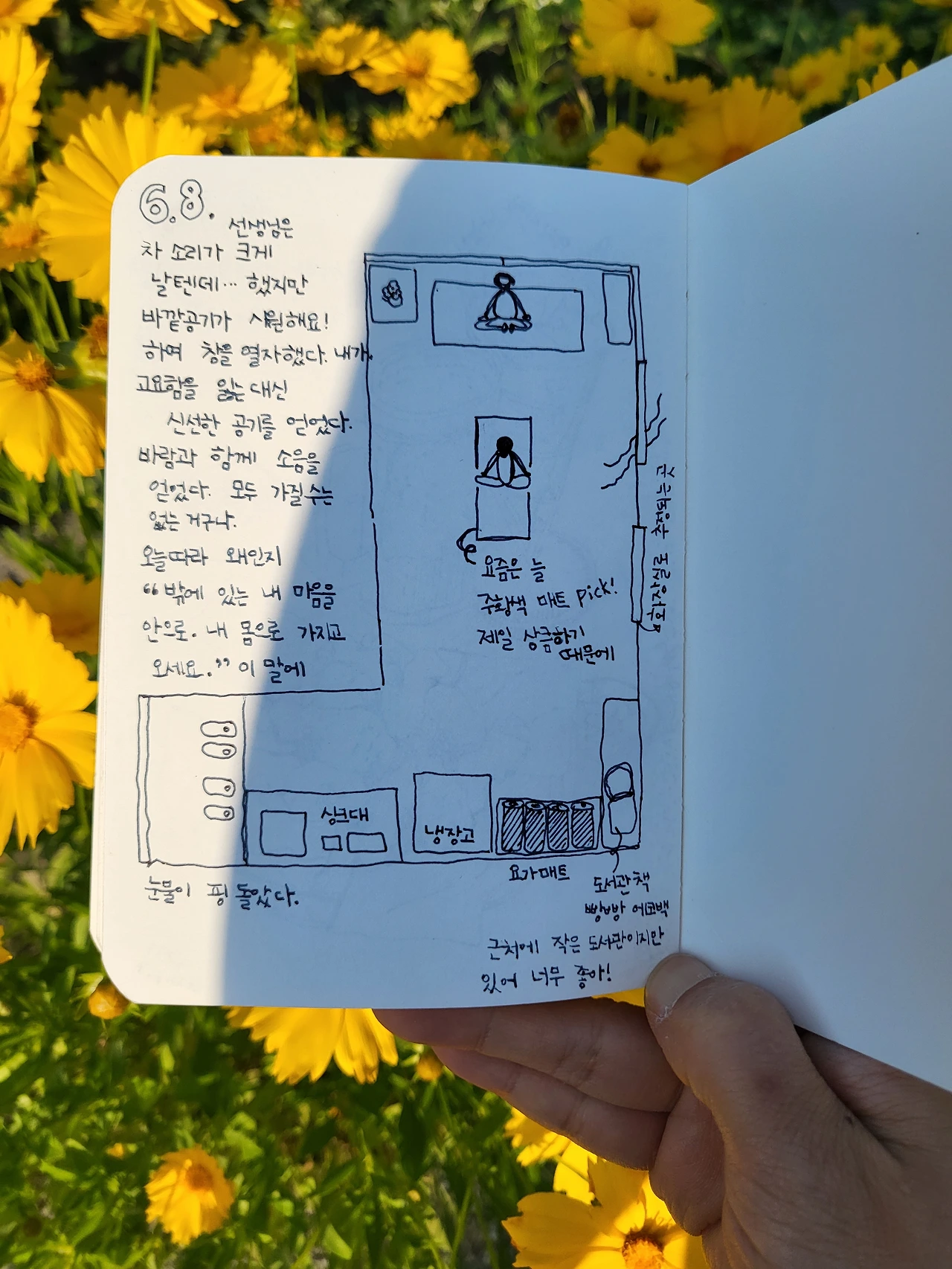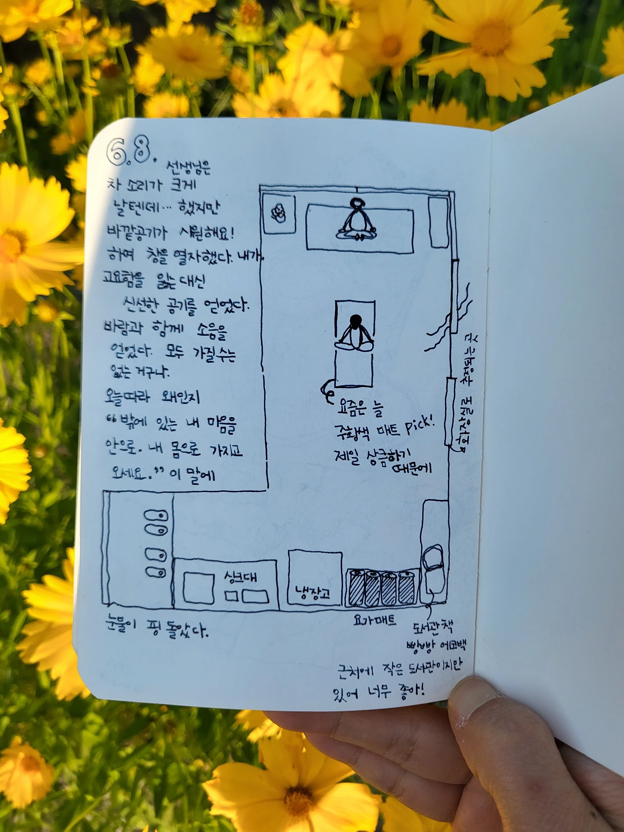 처음 요가원이 이사 왔을 때 따라왔던 사람은 나뿐. 선생님과 마주 보며 단 둘이 요가를 한다는 것에 부담감이 있었지만 요가를 하고 싶다는 마음이 더 컸었나 보다.