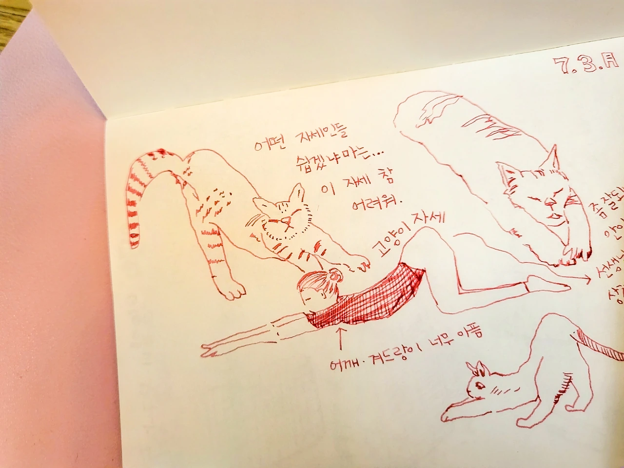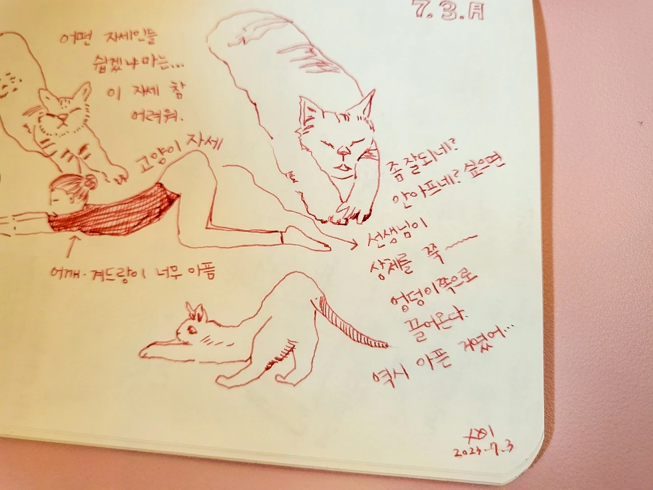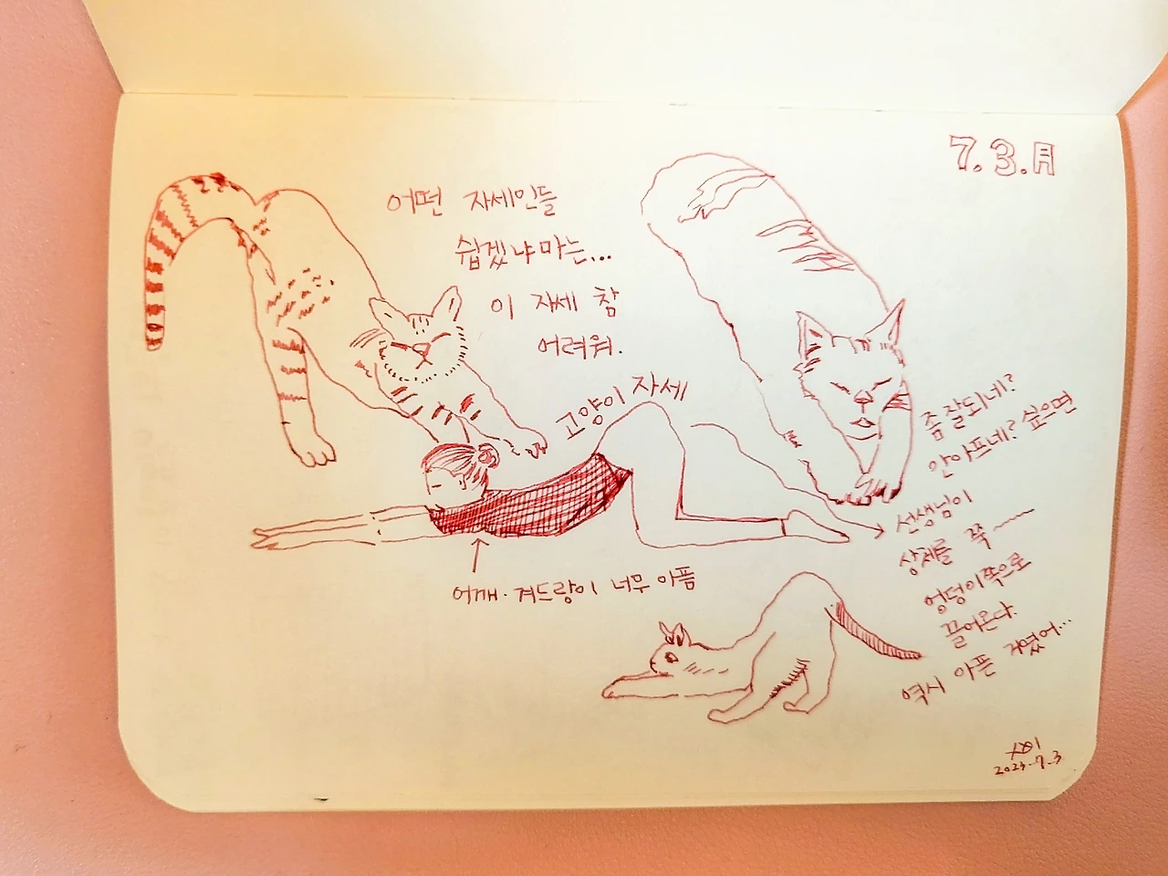 안 되는 고양이 자세를 애써하면서 다짐했다. 정말 내일은 틈틈이 내 어깨를 기억해 주겠어.