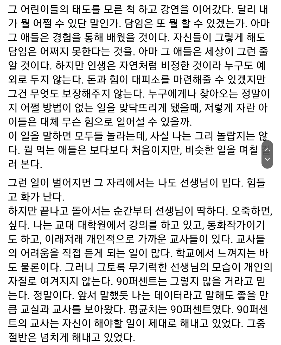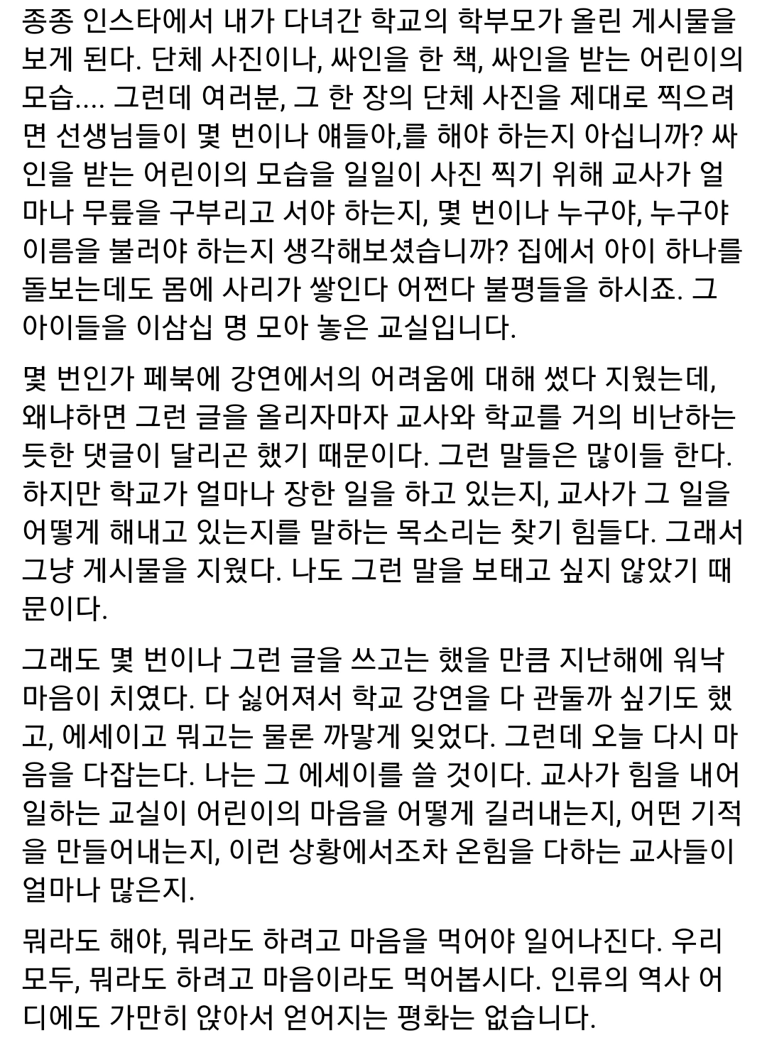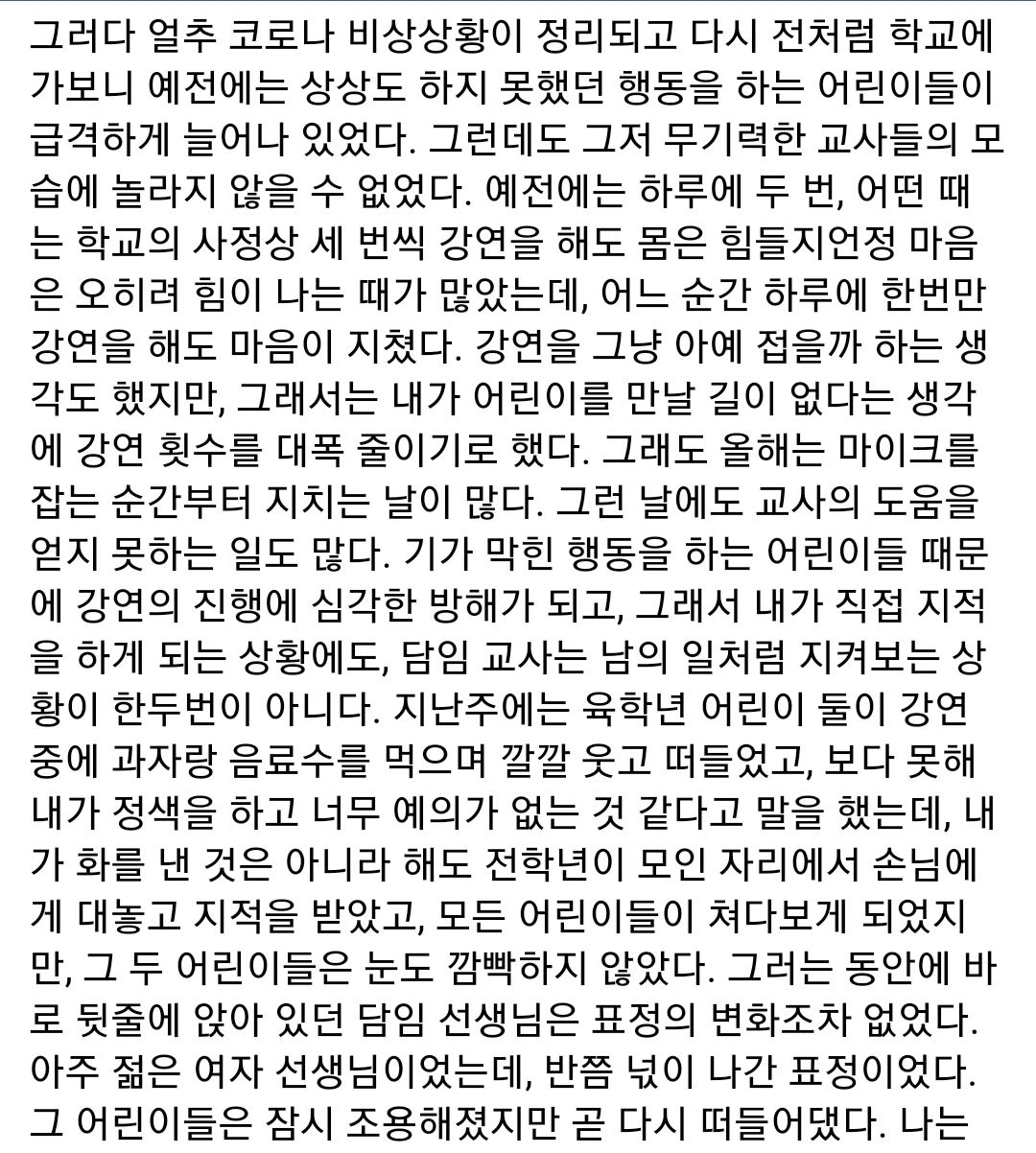타인에게 피해를 줄 때 행동을 막기 위해 "00야."라고 말하면 공개적으로 이름을 불렀다고 아동학대법에 저촉된다고 한다. 하루에도 몇 번씩 교실의 안전과 질서를 위해 아동학대법 테두리 안에서 아슬아슬하게 오간다. 어느 구성원과 학부모가 있느냐에 따라 운이 나쁘면 아동학대법에 걸리는 것이고 운이 좋으면 한 해를 무사히 넘기는 것이다. 난 운이 좋았을 뿐이고, 마음 아프게도 세상을 떠난 애기샘은 운이 나빴던 것이다.